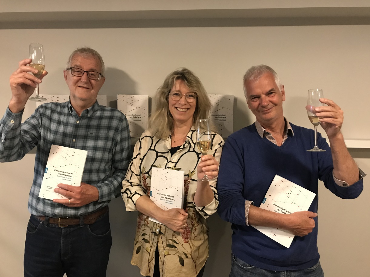 De tiende druk van Communicatiekaart van Nederland is van de pers gerold. Uitgever Mirjam Bonting proost samen met de auteurs op dit feestelijke moment.