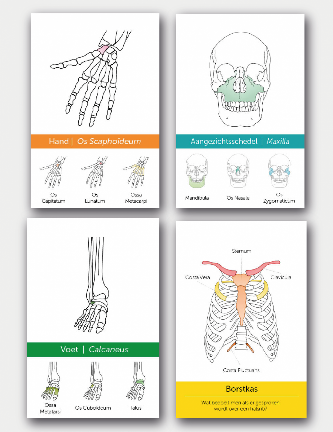 De Ossa Metatarsi, de Ossa Metacarpi, de Costa Fluctuans…allemaal benamingen van de vele botten die wij als mens hebben en die studenten moeten beheersen. Maar dat is een hele opgave. Het Skeletkwartet biedt uitkomst, want hiermee leert de student op een leuke en leerzame manier meer over al onze botten. Hoeveel botjes zitten er bijvoorbeeld in één hand? En wat zijn fontanellen en wanneer sluiten deze?
