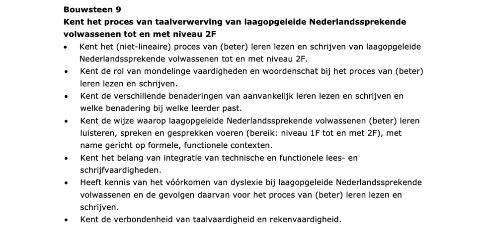 Onder basisvaardigheden vallen vier vakgebieden, die met elkaar samenhangen: Nederlands voor Nederlandstaligen, Nederlands voor anderstaligen, rekenen en digitale vaardigheden. Een docent basisvaardigheden moet vakbekwaamheid hebben voor alle vier de gebieden. Daarnaast moet zij beschikken over algemene professionele competenties. Het Raamwerk docent basisvaardigheden deelt de benodigde competenties voor deze vijf onderdelen in in 29 bouwstenen. Een bouwsteen ziet er bijvoorbeeld zo uit: