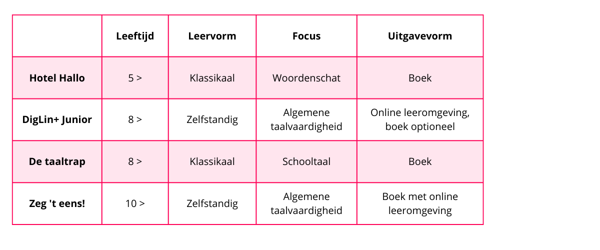 We hebben bovenstaande methodes ondergebracht in een tabel, zodat je de juiste methode kunt kiezen voor jouw leerlingen.