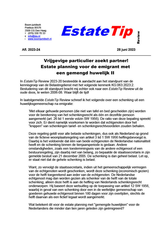 De digitale nieuwsbrief EstateTip Review informeert de estate planner wekelijks over actuele ontwikkelingen op het terrein van de estate planning. EstateTip Review bevat juridisch relevante informatie met betrekking tot de vermogensoverheveling op zowel civiel als fiscaal terrein. Met deze nieuwsbrief is de estate planner altijd op de hoogte van de meest actuele ontwikkelingen en beschikt hij tevens over de nieuwste modellen en tips.