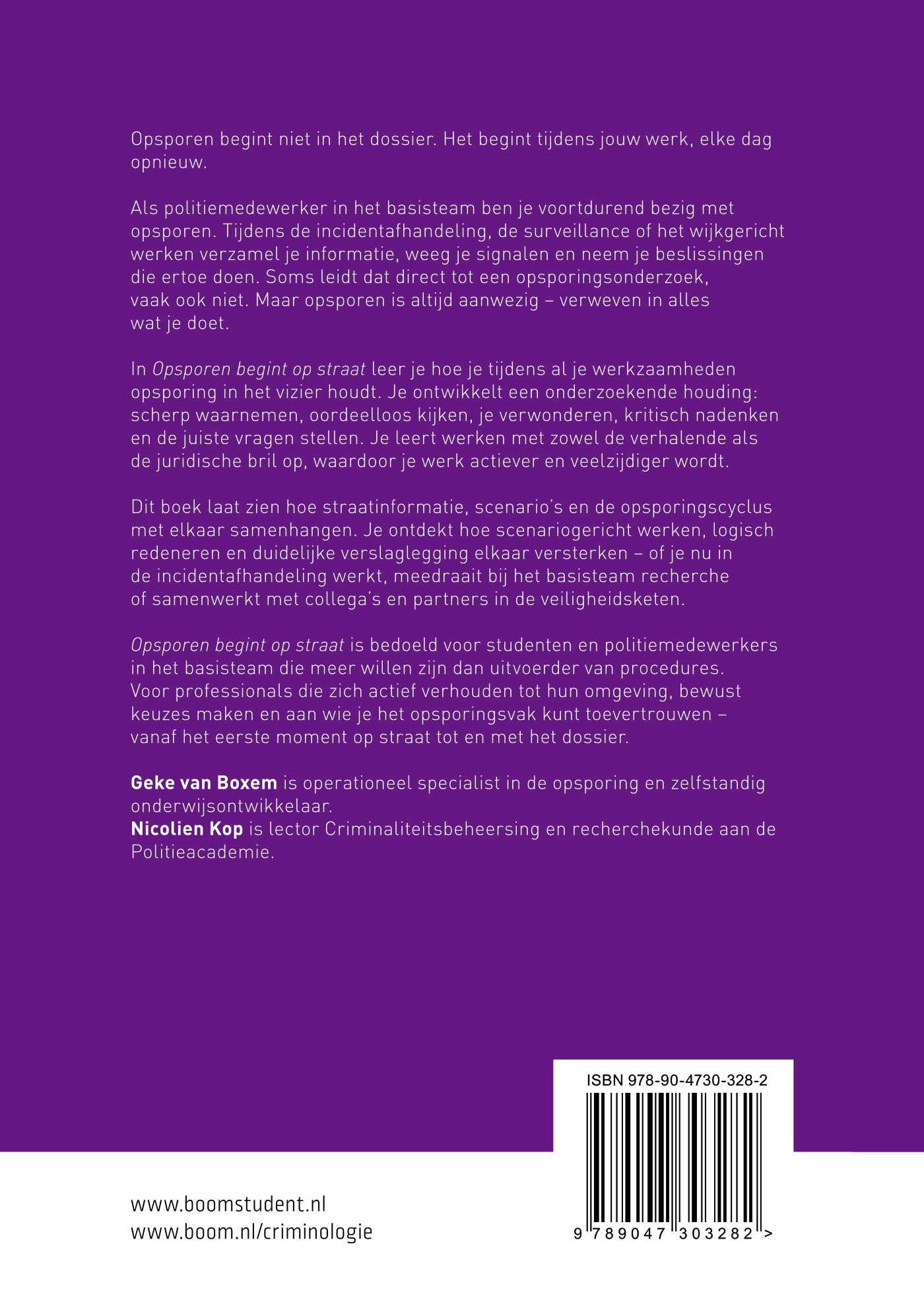 In Opsporen begint op straat leer je hoe je tijdens al je werkzaamheden opsporing in het vizier houdt. Je ontwikkelt een onderzoekende houding: scherp waarnemen, oordeelloos kijken, je verwonderen, kritisch nadenken en de juiste vragen stellen. Je leert werken met zowel de verhalende als de juridische bril op, waardoor je werk actiever en veelzijdiger wordt. Dit boek laat zien hoe straatinformatie, scenario’s en de opsporingscyclus met elkaar samenhangen. Je ontdekt hoe scenariogericht werken, logisch redeneren en duidelijke verslaglegging elkaar versterken – of je nu in de incidentafhandeling werkt, meedraait bij het basisteam recherche of samenwerkt met collega’s en partners in de veiligheidsketen.