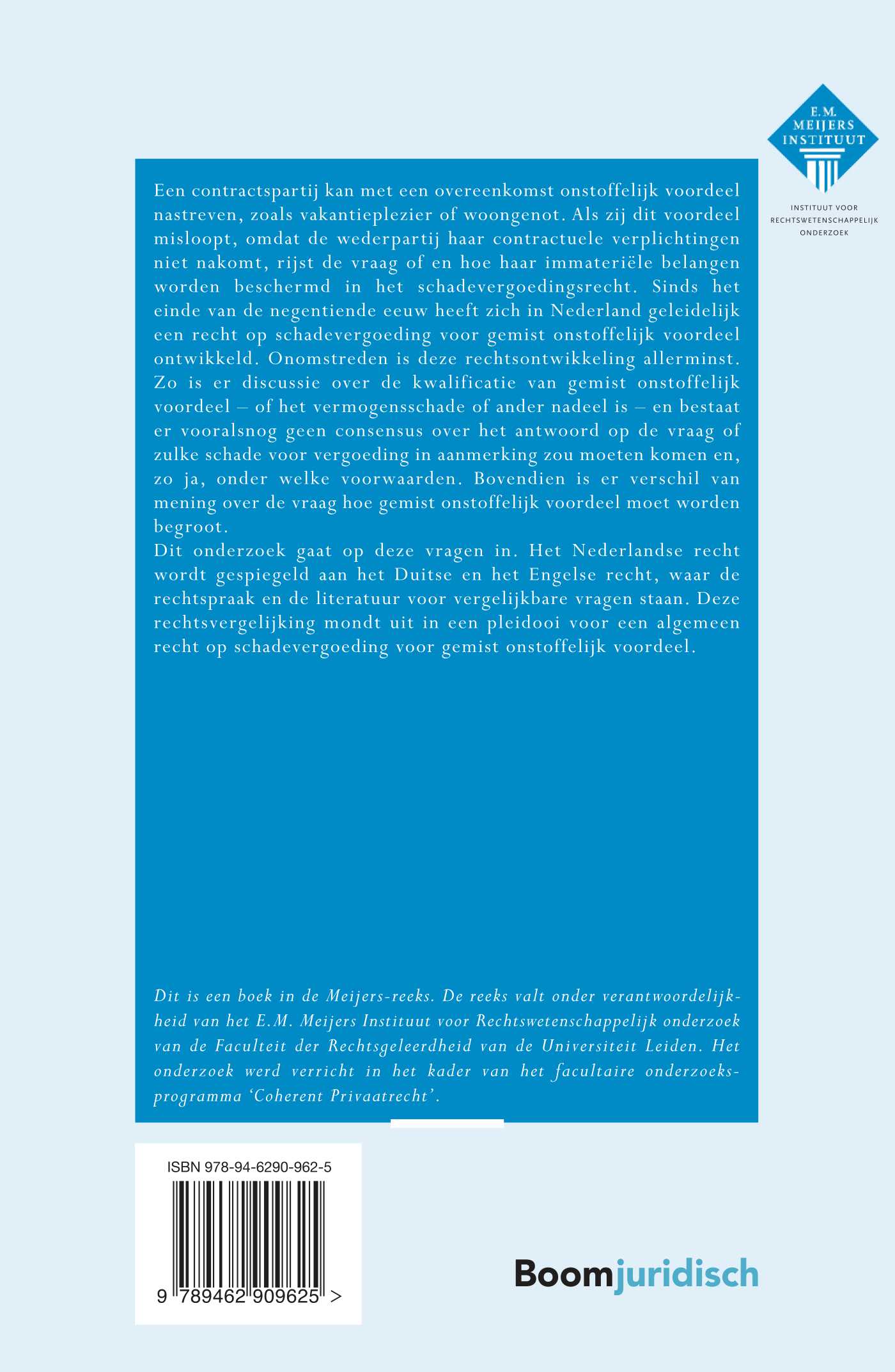 Dit onderzoek gaat op deze vragen in. Het Nederlandse recht wordt gespiegeld aan het Duitse en het Engelse recht, waar de rechtspraak en de literatuur voor vergelijkbare vragen staan. Deze rechtsvergelijking mondt uit in een pleidooi voor een algemeen recht op schadevergoeding voor gemist onstoffelijk voordeel.