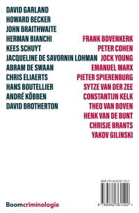 Aan het woord komen onder meer: Jock Young / David Garland / Howard Becker / John Braithwaite / Jacqueline de Savornin Lohman / Abram de Swaan / André Köbben / Frank Bovenkerk / Peter Cohen / Pieter Spierenburg / Kees Schuyt / Henk van de Bunt / Chrisje Brants / Chris Eliaerts. Met een inleiding van Marc Schuilenburg en Dina Siegel.