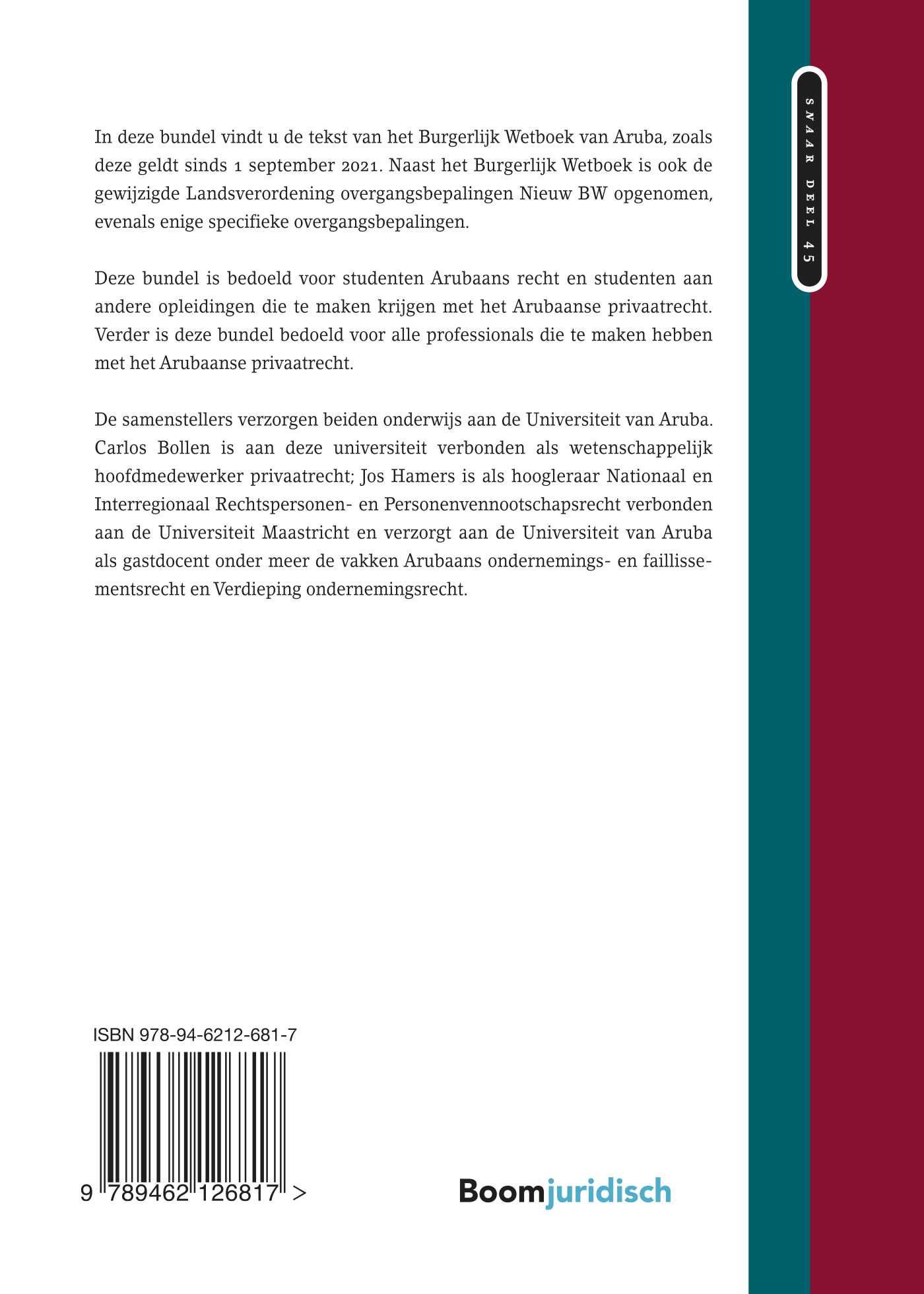 In deze bundel vindt u de tekst van het Burgerlijk Wetboek van Aruba, zoals deze geldt sinds 1 september 2021. Naast het Burgerlijk Wetboek is ook de gewijzigde Landsverordening overgangsbepalingen Nieuw BW opgenomen, evenals enige specifieke overgangsbepalingen.