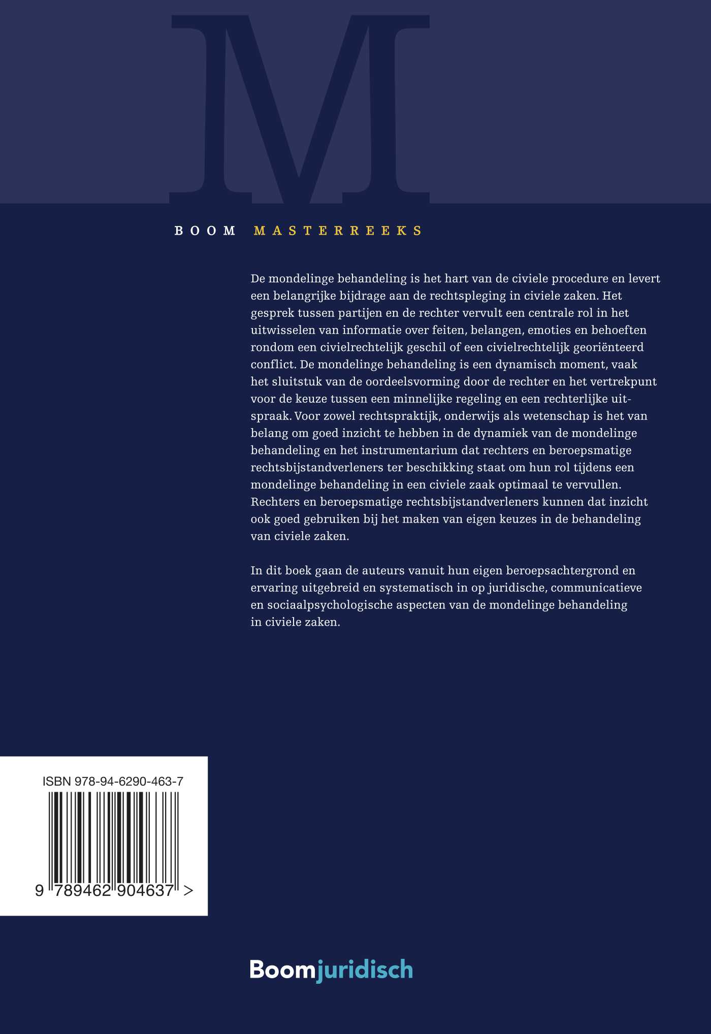De mondelinge behandeling is het hart van de civiele procedure en levert een belangrijke bijdrage aan de rechtspleging in civiele zaken. Het gesprek tussen partijen en de rechter vervult een centrale rol in het uitwisselen van informatie over feiten, belangen, emoties en behoeften rondom een civielrechtelijk geschil of een civielrechtelijk georiënteerd conflict. De mondelinge behandeling is een dynamisch moment, vaak het sluitstuk van de oordeelsvorming door de rechter en het vertrekpunt voor de keuze tussen een minnelijke regeling en een rechterlijke uitspraak. Voor zowel rechtspraktijk, onderwijs als wetenschap is het van belang om goed inzicht te hebben in de dynamiek van de mondelinge behandeling en het instrumentarium dat rechters en beroepsmatige rechtsbijstandverleners ter beschikking staat om hun rol tijdens een mondelinge behandeling in een civiele zaak optimaal te vervullen. Rechters en beroepsmatige rechtsbijstandverleners kunnen dat inzicht ook goed gebruiken bij het maken van eigen keuzes in de behandeling van civiele zaken.