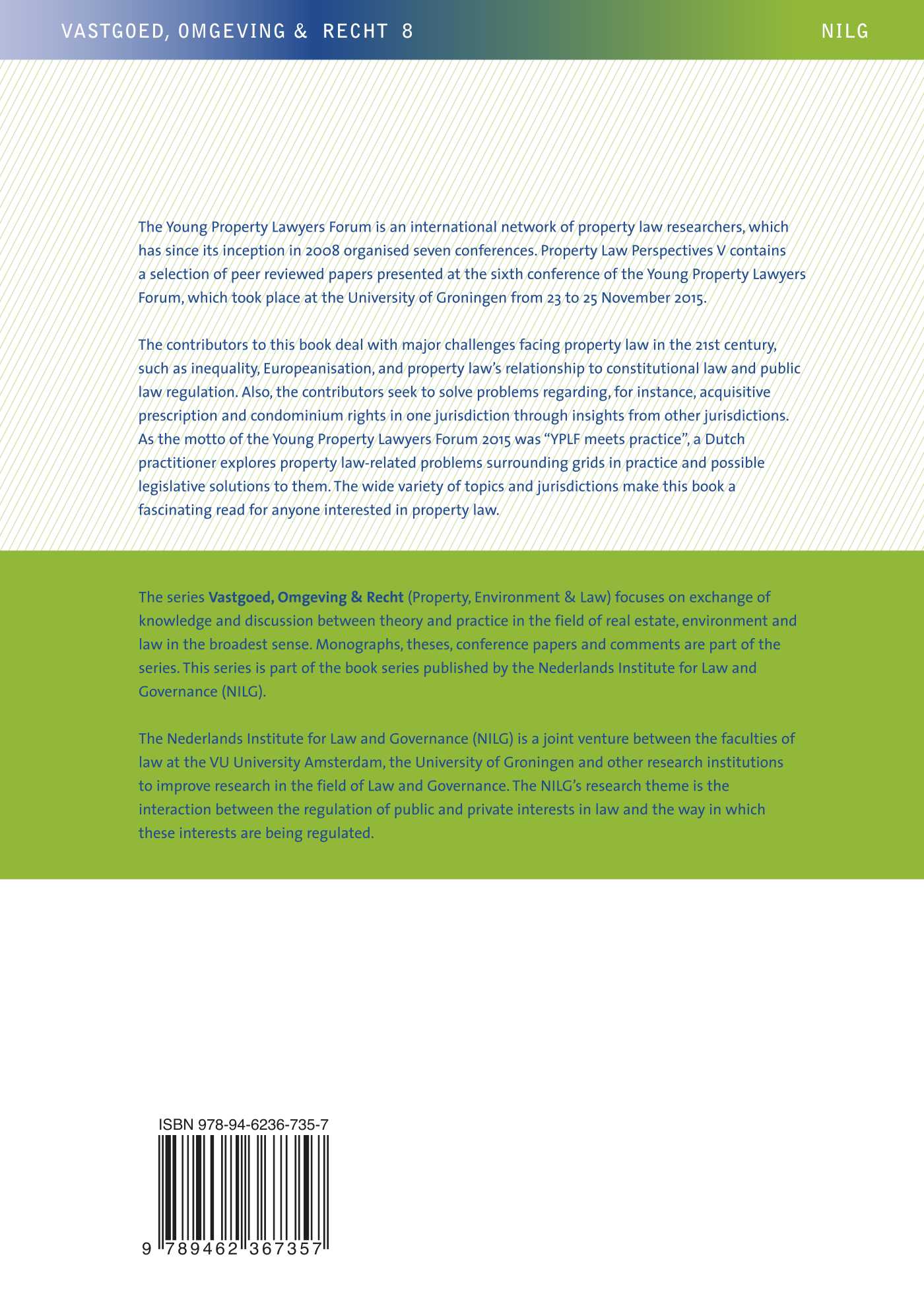 The Young Property Lawyers Forum is an international network of property law researchers, which has since its inception in 2008 organised seven conferences. Property Law Perspectives V contains a selection of peer reviewed papers presented at the sixth conference of the Young Property Lawyers Forum, which took place at the University of Groningen from 23 to 25 November 2015.