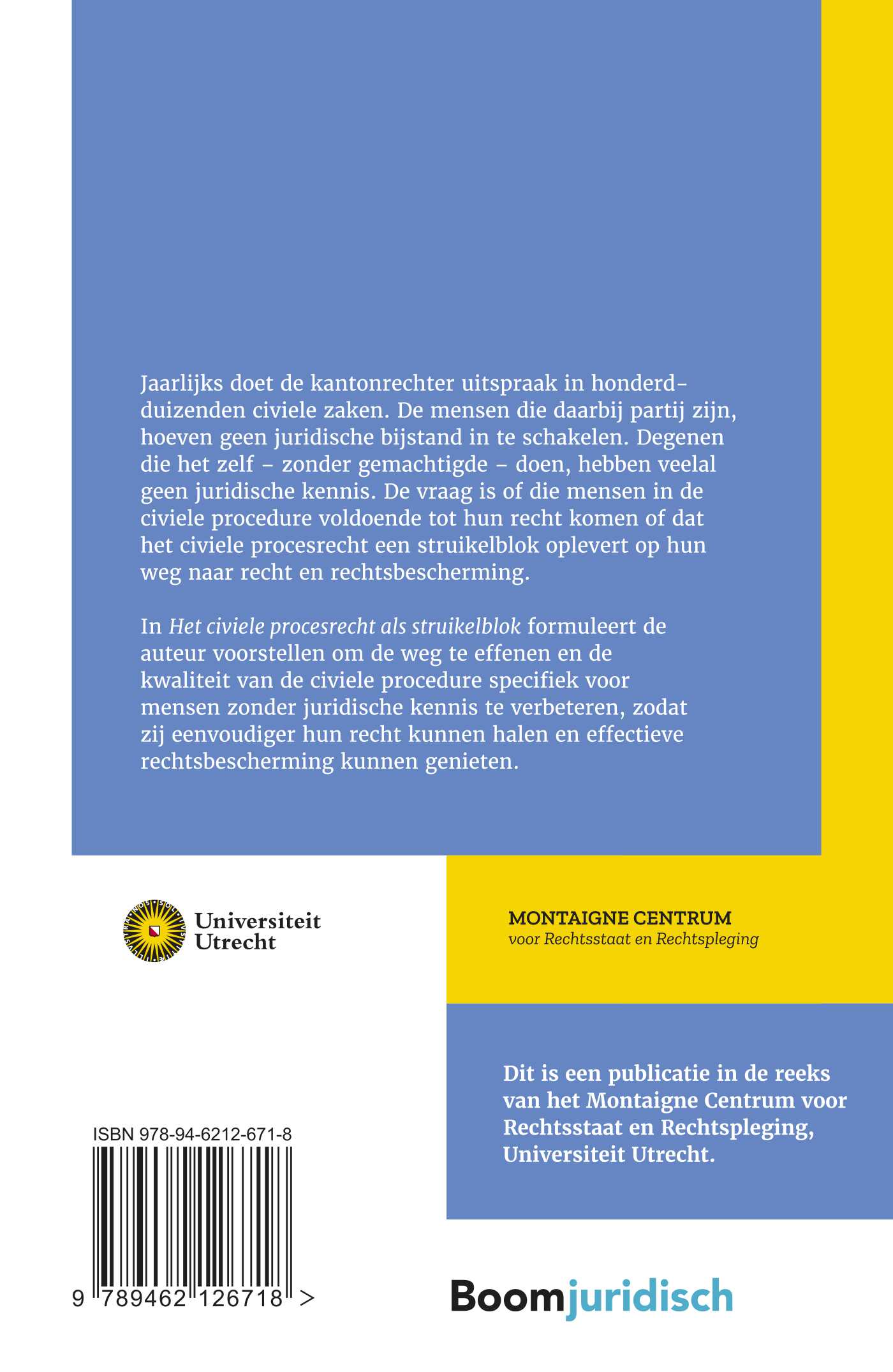 In Het civiele procesrecht als struikelblok formuleert de auteur voorstellen om de weg te effenen en de kwaliteit van de civiele procedure specifiek voor mensen zonder juridische kennis te verbeteren, zodat zij eenvoudiger hun recht kunnen halen en effectieve rechtsbescherming kunnen genieten.