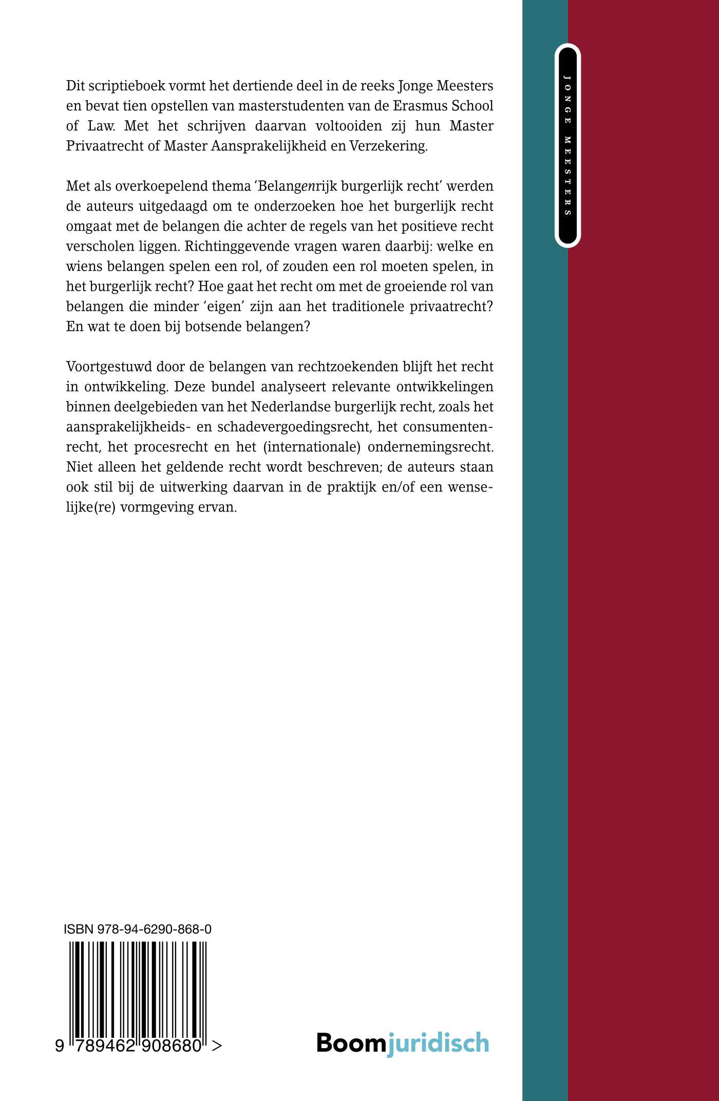 Dit scriptieboek vormt het dertiende deel in de reeks Jonge Meesters en bevat tien opstellen van masterstudenten van de Erasmus School of Law. Met het schrijven daarvan voltooiden zij hun Master Privaatrecht of Master Aansprakelijkheid en Verzekering.