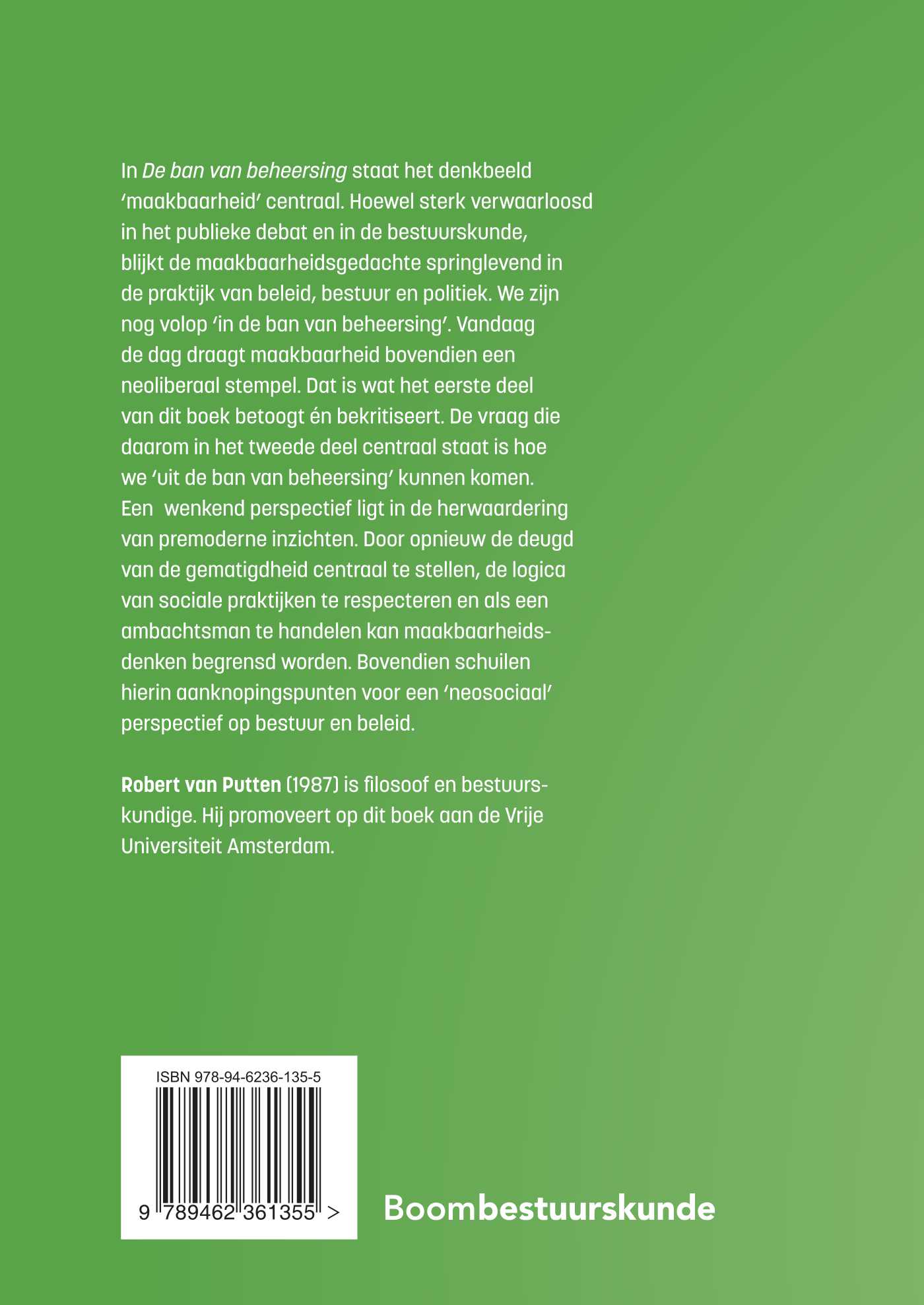 In De ban van beheersing staat het denkbeeld ‘maakbaarheid’ centraal. Hoewel sterk verwaarloosd in het publieke debat en in de bestuurskunde, blijkt de maakbaarheidsgedachte springlevend in de praktijk van beleid, bestuur en politiek. We zijn nog volop ‘in de ban van beheersing’. Vandaag de dag draagt maakbaarheid bovendien een neoliberaal stempel. Dat is wat het eerste deel van dit boek betoogt én bekritiseert. De vraag die daarom in het tweede deel centraal staat is hoe we ‘uit de ban van beheersing’ kunnen komen. Een wenkend perspectief ligt in de herwaardering van premoderne inzichten. Door opnieuw de deugd van de gematigdheid centraal te stellen, de logica van sociale praktijken te respecteren en als een ambachtsman te handelen kan maakbaarheidsdenken begrensd worden. Bovendien schuilen hierin aanknopingspunten voor een ‘neosociaal’ perspectief op bestuur en beleid.