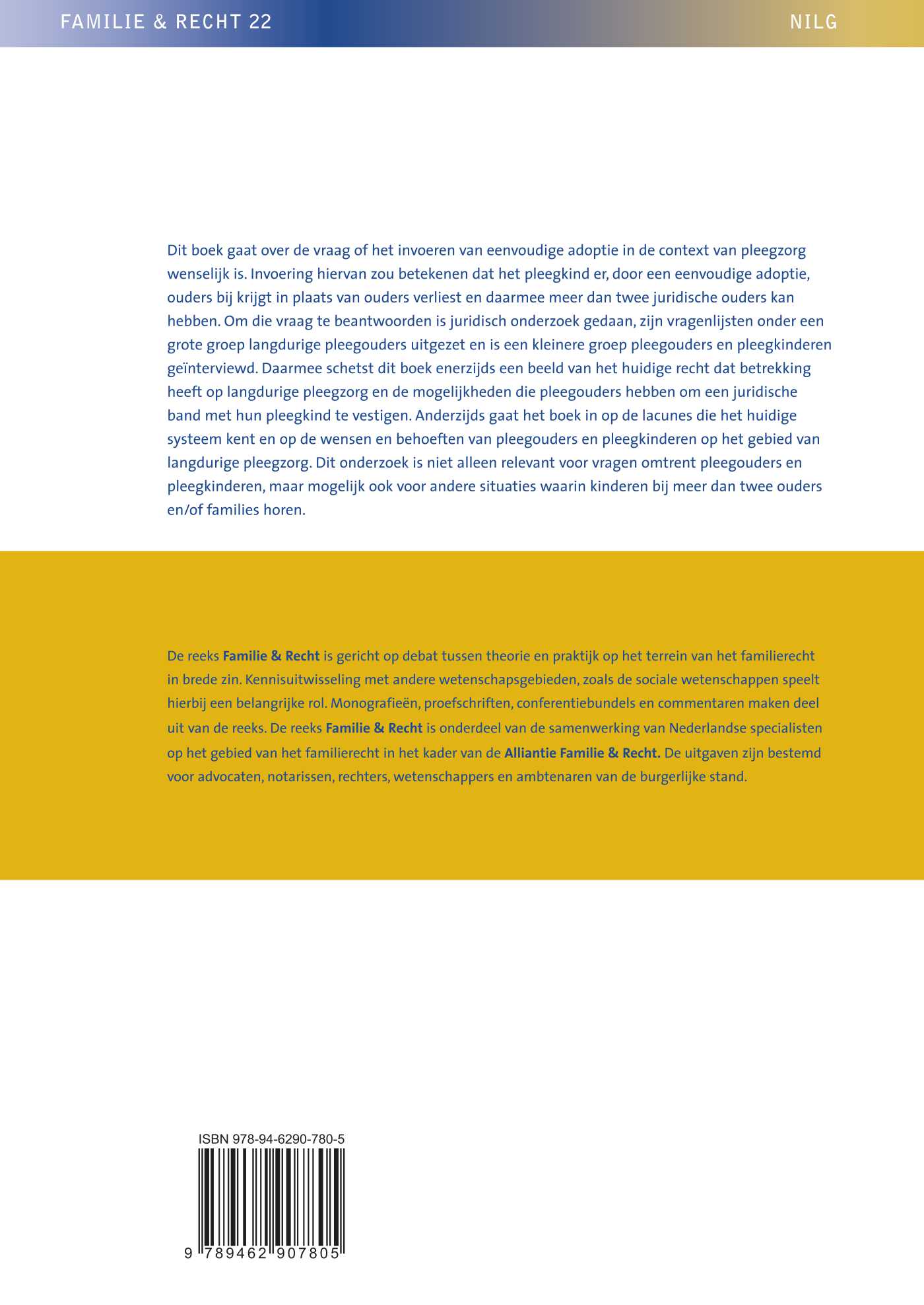 Dit boek gaat over de vraag of het invoeren van eenvoudige adoptie in de context van pleegzorg wenselijk is. Invoering hiervan zou betekenen dat het pleegkind er, door een eenvoudige adoptie, ouders bij krijgt in plaats van ouders verliest en daarmee meer dan twee juridische ouders kan hebben. Om die vraag te beantwoorden is juridisch onderzoek gedaan, zijn vragenlijsten onder een grote groep langdurige pleegouders uitgezet en is een kleinere groep pleegouders en pleegkinderen geïnterviewd. Daarmee schetst dit boek enerzijds een beeld van het huidige recht dat betrekking heeft op langdurige pleegzorg en de mogelijkheden die pleegouders hebben om een juridische band met hun pleegkind te vestigen. Anderzijds gaat het boek in op de lacunes die het huidige systeem kent en op de wensen en behoeften van pleegouders en pleegkinderen op het gebied van langdurige pleegzorg. Dit onderzoek is niet alleen relevant voor vragen omtrent pleegouders en pleegkinderen, maar mogelijk ook voor andere situaties waarin kinderen bij meer dan twee ouders en/of families horen.