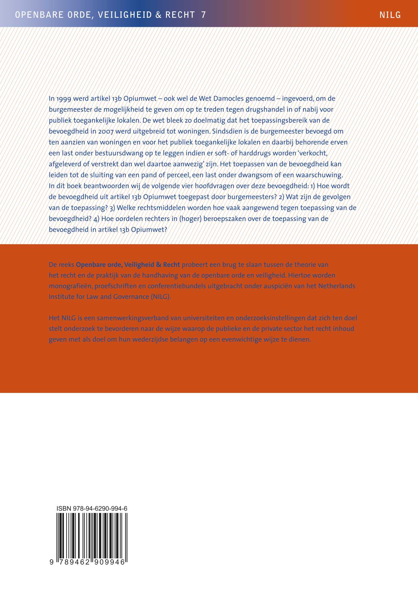 In 1999 werd artikel 13b Opiumwet – ook wel de Wet Damocles genoemd – ingevoerd, om de burgemeester de mogelijkheid te geven om op te treden tegen drugshandel in of nabij voor publiek toegankelijke lokalen. De wet bleek zo doelmatig dat het toepassingsbereik van de bevoegdheid in 2007 werd uitgebreid tot woningen. Sindsdien is de burgemeester bevoegd om ten aanzien van woningen en voor het publiek toegankelijke lokalen en daarbij behorende erven een last onder bestuursdwang op te leggen indien er soft- of harddrugs worden ‘verkocht, afgeleverd of verstrekt dan wel daartoe aanwezig’ zijn. Het toepassen van de bevoegdheid kan leiden tot de sluiting van een pand of perceel, een last onder dwangsom of een waarschuwing. In dit boek beantwoorden wij de volgende vier hoofdvragen over deze bevoegdheid: 1) Hoe wordt de bevoegdheid uit artikel 13b Opiumwet toegepast door burgemeesters? 2) Wat zijn de gevolgen van de toepassing? 3) Welke rechtsmiddelen worden hoe vaak aangewend tegen toepassing van de bevoegdheid? 4) Hoe oordelen rechters in (hoger) beroepszaken over de toepassing van de bevoegdheid in artikel 13b Opiumwet?