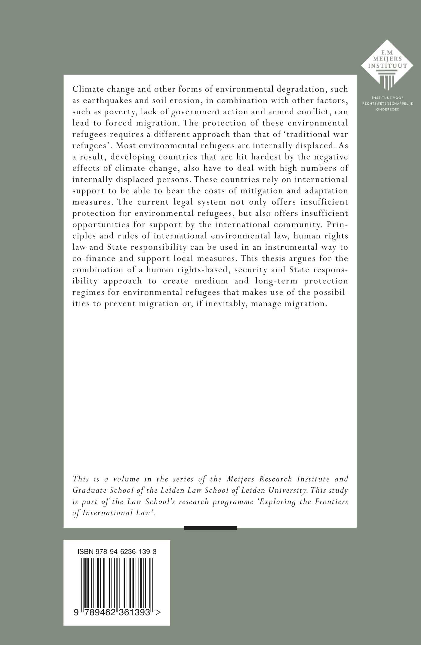 Climate change and other forms of environmental degradation, such as earthquakes and soil erosion, in combination with other factors, such as poverty, lack of government action and armed conflict, can lead to forced migration. The protection of these environmental refugees requires a different approach than that of ‘traditional war refugees’. Most environmental refugees are internally displaced. As a result, developing countries that are hit hardest by the negative effects of climate change, also have to deal with high numbers of internally displaced persons. These countries rely on international support to be able to bear the costs of mitigation and adaptation measures. The current legal system not only offers insufficient protection for environmental refugees, but also offers insufficient opportunities for support by the international community. Principles and rules of international environmental law, human rights law and State responsibility can be used in an instrumental way to co-finance and support local measures. This thesis argues for the combination of a human rights-based, security and State responsibility approach to create medium and long-term protection regimes for environmental refugees that makes use of the possibilities to prevent migration or, if inevitably, manage migration.