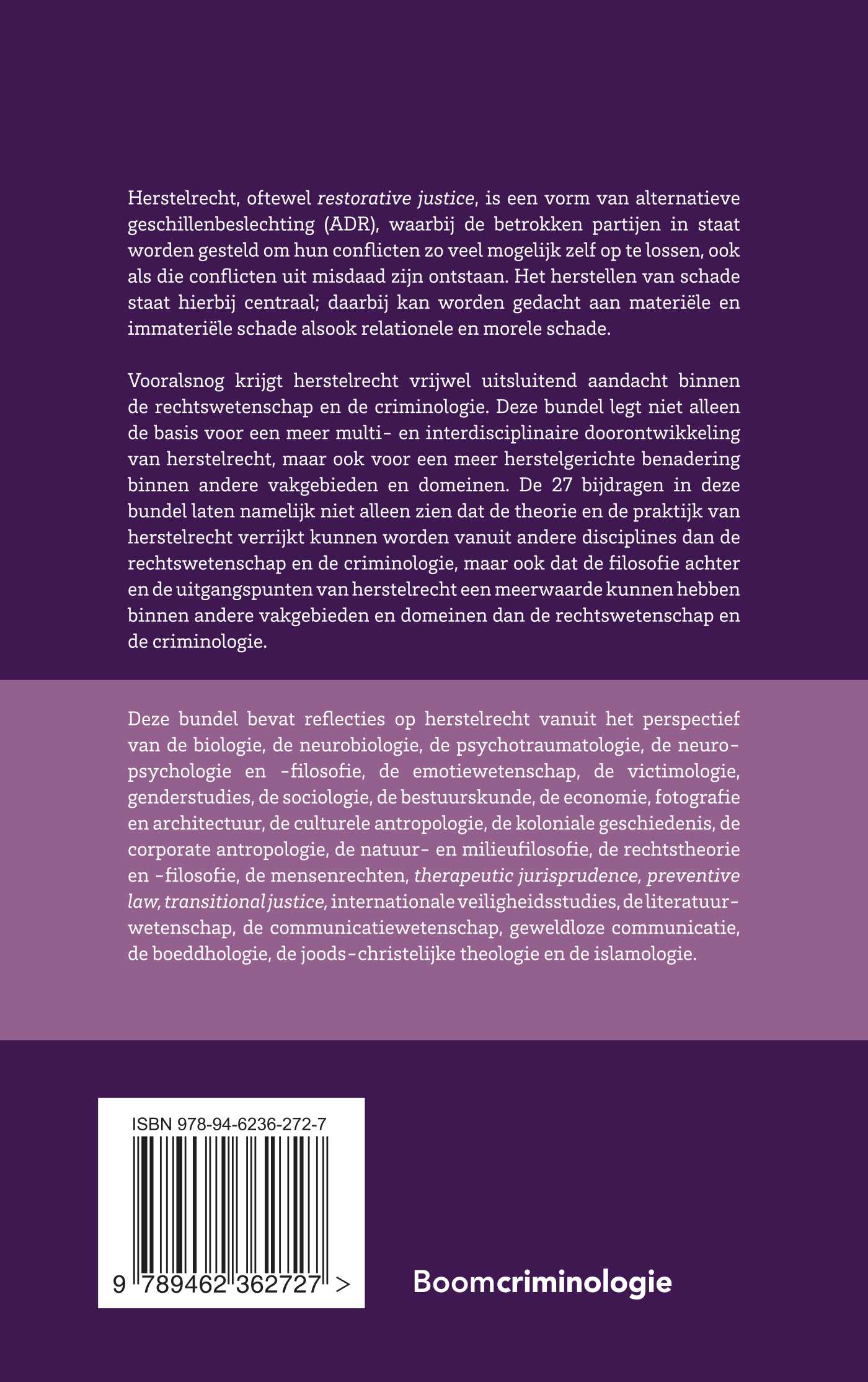 Vooralsnog krijgt herstelrecht vrijwel uitsluitend aandacht binnen de rechtswetenschap en de criminologie. Deze bundel legt niet alleen de basis voor een meer multi- en interdisciplinaire doorontwikkeling van herstelrecht, maar ook voor een meer herstelgerichte benadering binnen andere vakgebieden en domeinen. De 27 bijdragen in deze bundel laten namelijk niet alleen zien dat de theorie en de praktijk van herstelrecht verrijkt kunnen worden van uit andere disciplines dan de rechts wetenschappen de criminologie, maar ook dat de filosofie achter en de uitgangspunten van herstelrecht een meerwaarde kunnen hebben binnen andere vakgebieden en domeinen dan de rechtswetenschap en de criminologie.
