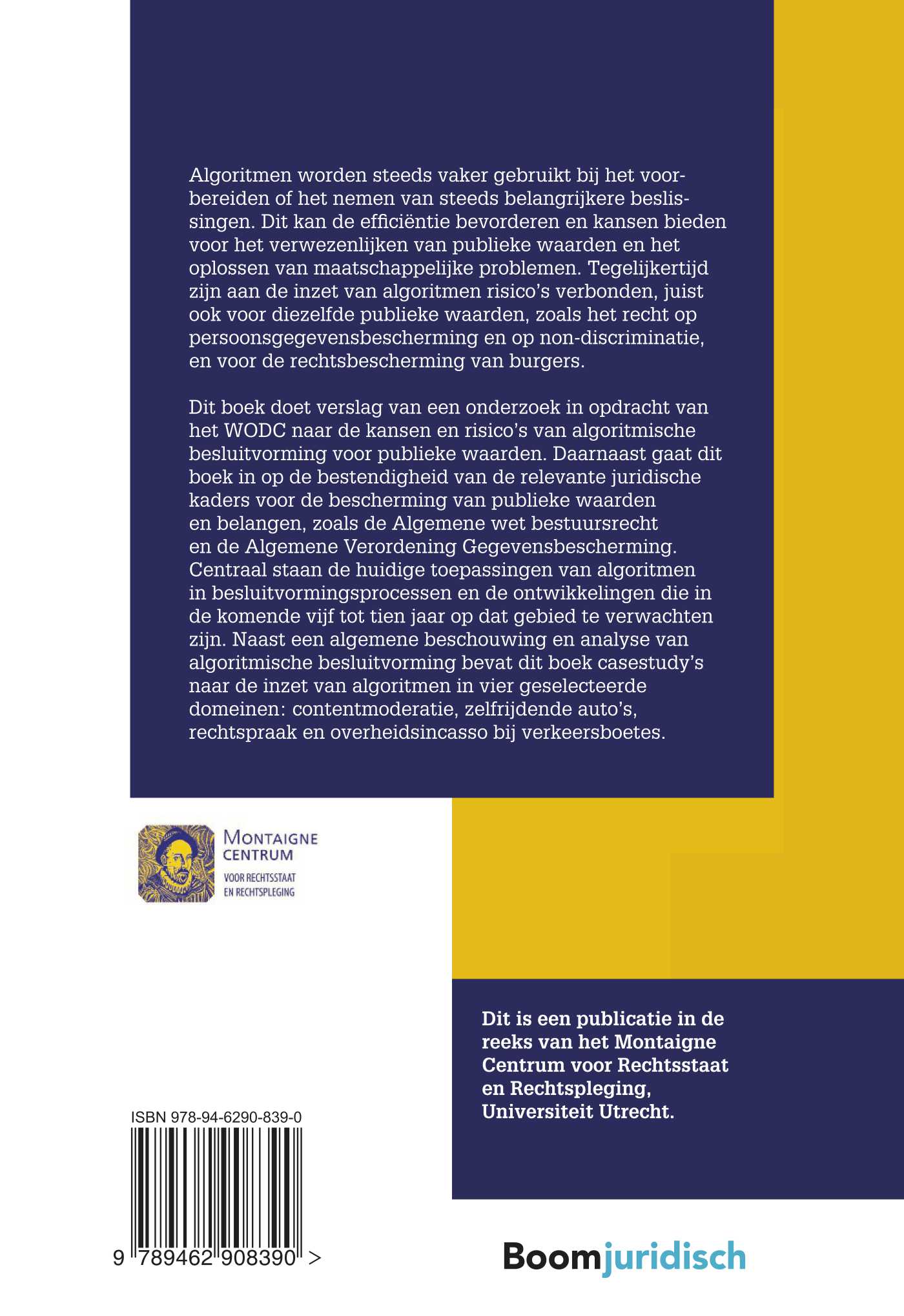 Dit boek doet verslag van een onderzoek in opdracht van het WODC naar de kansen en risico’s van algoritmische besluitvorming voor publieke waarden. Daarnaast gaat dit boek in op de bestendigheid van de relevante juridische kaders voor de bescherming van publieke waarden en belangen, zoals de Algemene wet bestuursrecht en de Algemene Verordening Gegevensbescherming. Centraal staan de huidige toepassingen van algoritmen in besluitvormingsprocessen en de ontwikkelingen die in de komende vijf tot tien jaar op dat gebied te verwachten zijn. Naast een algemene beschouwing en analyse van algoritmische besluitvorming bevat dit boek casestudy’s naar de inzet van algoritmen in vier geselecteerde domeinen: contentmoderatie, zelfrijdende auto’s, rechtspraak en overheidsincasso bij verkeersboetes.