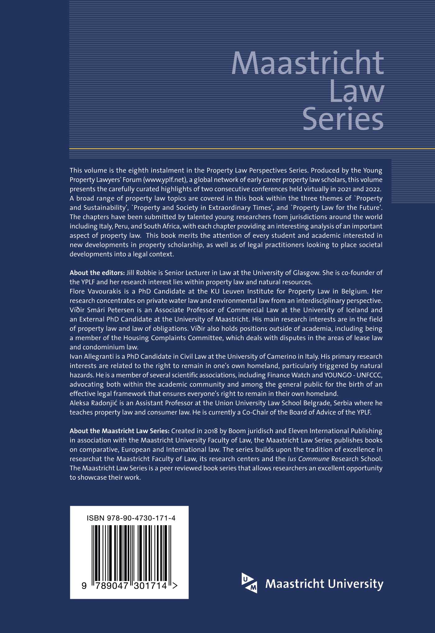 This volume is the eighth instalment in the Property Law Perspectives Series. Produced by the Young Property Lawyers' Forum (www.yplf.net), a global network of early career property law scholars, this volume presents the carefully curated highlights of two consecutive conferences held virtually in 2021 and 2022. A broad range of property law topics are covered in this book within the three themes of `Property and Sustainability', `Property and Society in Extraordinary Times', and `Property Law for the Future'. The chapters have been submitted by talented young researchers from jurisdictions around the world including Italy, Peru, and South Africa, with each chapter providing an interesting analysis of an important aspect of property law. This book merits the attention of every student and academic interested in new developments in property scholarship, as well as of legal practitioners looking to place societal developments into a legal context.