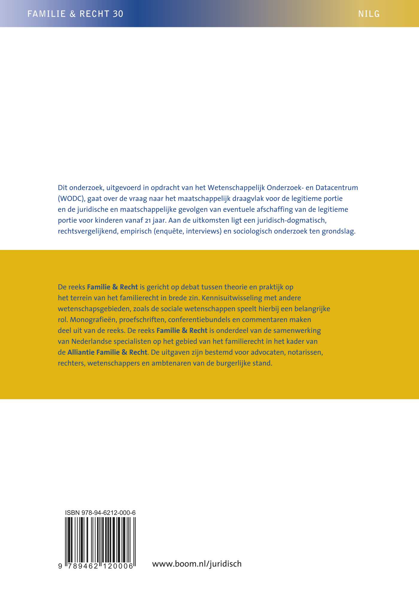 Dit onderzoek, uitgevoerd in opdracht van het Wetenschappelijk Onderzoek- en Datacentrum (WODC), gaat over de vraag naar het maatschappelijk draagvlak voor de legitieme portie en de juridische en maatschappelijke gevolgen van eventuele afschaffing van de legitieme portie voor kinderen vanaf 21 jaar. Aan de uitkomsten ligt een juridisch-dogmatisch, rechtsvergelijkend, empirisch (enquête, interviews) en sociologisch onderzoek ten grondslag.