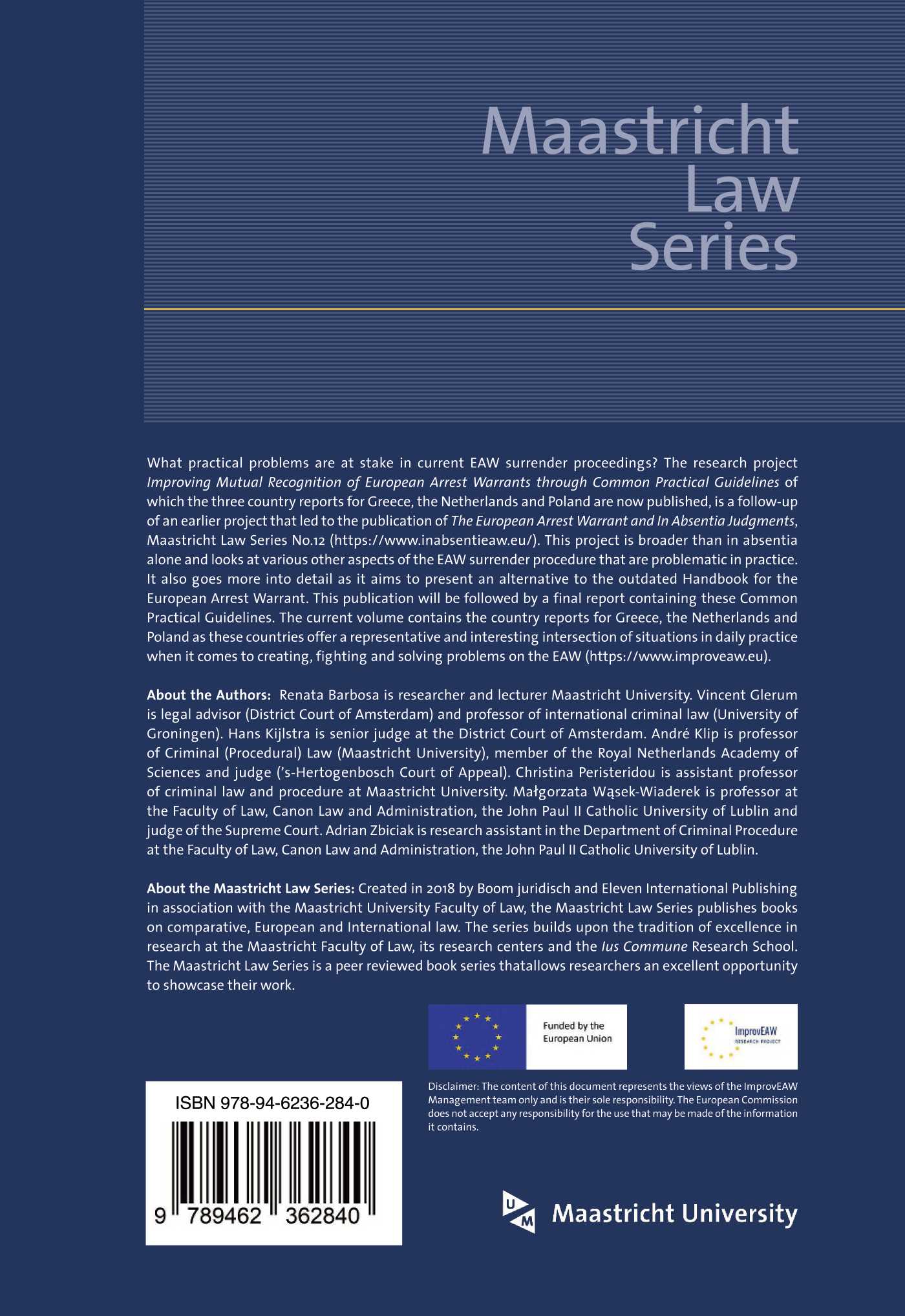 What practical problems are at stake in current EAW surrender proceedings? The research project Improving Mutual Recognition of European Arrest Warrants through Common Practical Guidelines of which the three country reports for Greece, the Netherlands and Poland are now published, is a follow-up of an earlier project that led to the publication of The European Arrest Warrant and In Absentia Judgments, Maastricht Law Series No.12 InAbsentiEAW. This project is broader than in absentia alone and looks at various other aspects of the EAW surrender procedure that are problematic in practice. It also goes more into detail as it aims to present an alternative to the outdated Handbook for the European Arrest Warrant. This publication will be followed by a final report containing these Common Practical Guidelines. The current volume contains the country reports for Greece, the Netherlands and Poland as these countries offer a representative and interesting intersection of situations in daily practice when it comes to creating, fighting and solving problems on the EAW ImprovEAW.