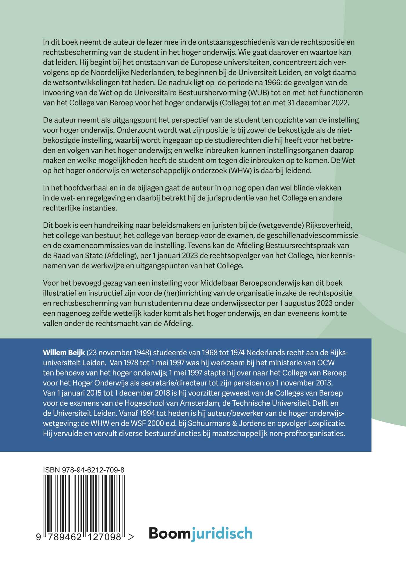 In dit boek neemt de auteur de lezer mee in de ontstaansgeschiedenis van de rechtspositie en rechtsbescherming van de student in het hoger onderwijs. Wie gaat daarover en waartoe kan dat leiden. Hij begint bij het ontstaan van de Europese universiteiten, concentreert zich vervolgens op de Noordelijke Nederlanden, te beginnen bij de Universiteit Leiden, en volgt daarna de wetsontwikkelingen tot heden. De nadruk ligt op de periode na 1966: de gevolgen van de invoering van de Wet op de Universitaire Bestuurs hervorming (WUB) tot en met het functioneren van het College van Beroep voor het hoger onderwijs (College) tot en met 31 december 2022.