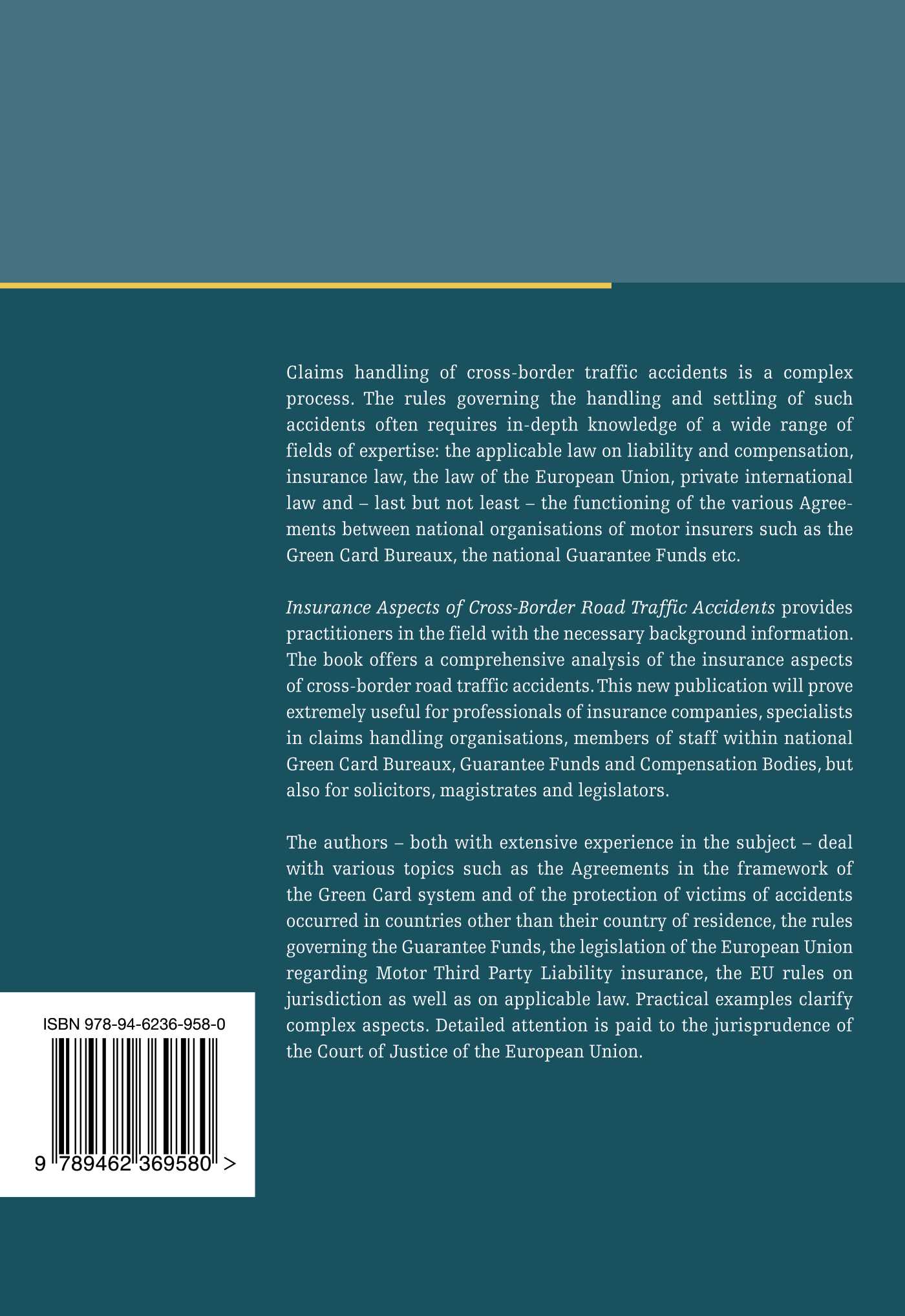 Insurance Aspects of Cross-Border Road Traffic Accidents provides practitioners in the field with the necessary background information. The book offers a comprehensive analysis of the insurance aspects of cross-border road traffic accidents. This new publication will prove extremely useful for professionals of insurance companies, specialists in claims handling organisations, members of staff within national Green Card Bureaux, Guarantee Funds and Compensation Bodies, but also for solicitors, magistrates and legislators.