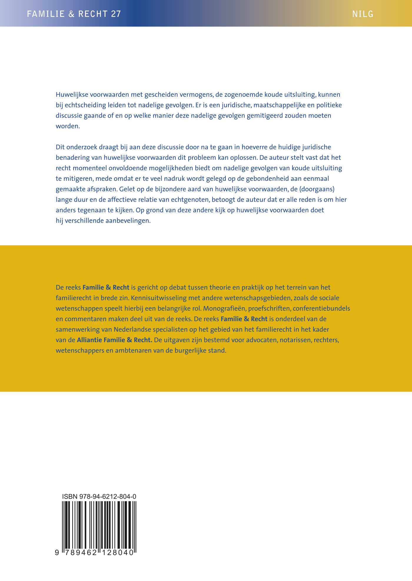 De reeks Familie & Recht is gericht op debat tussen theorie en praktijk op het terrein van het familierecht in brede zin. Kennisuitwisseling met andere wetenschapsgebieden, zoals de sociale wetenschappen speelt hierbij een belangrijke rol. Monografieën, proefschriften, conferentiebundels en commentaren maken deel uit van de reeks. De reeks Familie & Recht is onderdeel van de samenwerking van Nederlandse specialisten op het gebied van het familierecht in het kader van de Alliantie Familie & Recht. De uitgaven zijn bestemd voor advocaten, notarissen, rechters, wetenschappers en ambtenaren van de burgerlijke stand.