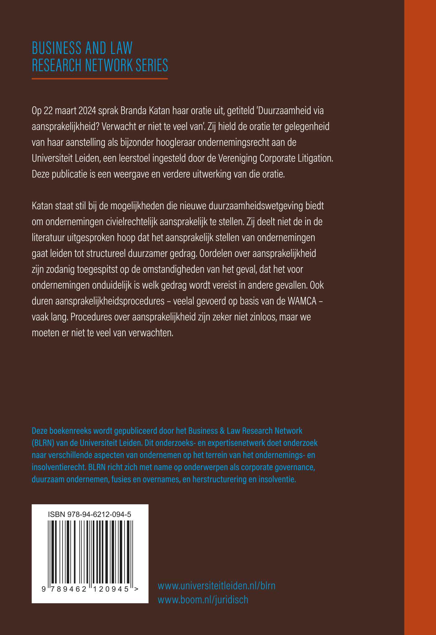 Op 22 maart 2024 sprak Branda Katan haar oratie uit, getiteld ‘Duurzaamheid via aansprakelijkheid? Verwacht er niet te veel van’. Zij hield de oratie ter gelegenheid van haar aanstelling als bijzonder hoogleraar ondernemingsrecht aan de Universiteit Leiden, een leerstoel ingesteld door de Vereniging Corporate Litigation. Deze publicatie is een weergave en verdere uitwerking van die oratie.