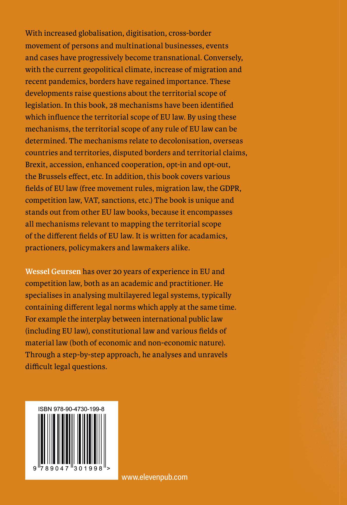 With increased globalisation, digitisation, cross-border movement of persons and multinational businesses, events and cases have progressively become transnational. Conversely, with the current geopolitical climate, increase of migration and recent pandemics, borders have regained importance. These developments raise questions about the territorial scope of legislation. In this book, 28 mechanisms have been identified which influence the territorial scope of EU law. By using these mechanisms, the territorial scope of any rule of EU law can be determined. The mechanisms relate to decolonisation, overseas countries and territories, disputed borders and territorial claims, Brexit, accession, enhanced cooperation, opt-in and opt-out, the Brussels effect, etc. In addition, this book covers various fields of EU law (free movement rules, migration law, the GDPR, competition law, VAT, sanctions, etc.). The book is unique and stands out from other EU law books, because it encompasses all mechanisms relevant to mapping the territorial scope of the different fields of EU law. It is written for academics, practitioners, policymakers and lawmakers alike.