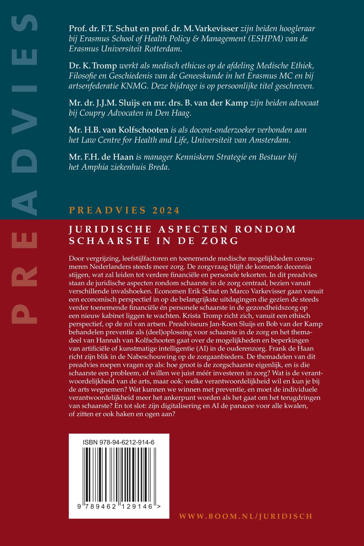 Door vergrijzing, leefstijlfactoren en toenemende medische mogelijkheden consumeren Nederlanders steeds meer zorg. De zorgvraag blijft de komende decennia stijgen, wat zal leiden tot verdere financiële en personele tekorten. In dit preadvies staan de juridische aspecten rondom schaarste in de zorg centraal, bezien vanuit verschillende invalshoeken. Economen Erik Schut en Marco Varkevisser gaan vanuit een economisch perspectief in op de belangrijkste uitdagingen die gezien de steeds verder toenemende financiële én personele schaarste in de gezondheidszorg op een nieuw kabinet liggen te wachten. Krista Tromp richt zich, vanuit een ethisch perspectief, op de rol van artsen. Preadviseurs Jan-Koen Sluijs en Bob van der Kamp behandelen preventie als (deel)oplossing voor schaarste in de zorg en het themadeel van Hannah van Kolfschooten gaat over de mogelijkheden en beperkingen van artificiële of kunstmatige intelligentie (AI) in de ouderenzorg. Frank de Haan richt zijn blik in de Nabeschouwing op de zorgaanbieders. De themadelen van dit preadvies roepen vragen op als: hoe groot is de zorgschaarste eigenlijk, en is die schaarste een probleem, of willen we juist méér investeren in zorg? Wat is de verantwoordelijkheid van de arts, maar ook: welke verantwoordelijkheid wil en kun je bij de arts wegnemen? Wat kunnen we winnen met preventie, en moet de individuele verantwoordelijkheid meer het ankerpunt worden als het gaat om het terugdringen van schaarste? En tot slot: zijn digitalisering en AI de panacee voor alle kwalen, of zitten er ook haken en ogen aan?