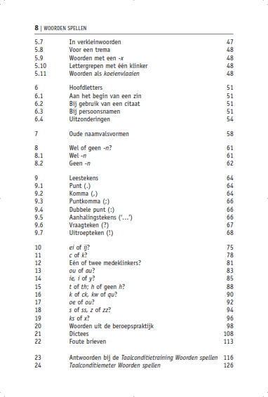 Met een zelftest, heldere uitleg en heel veel oefeningen helpt dit boekje je bij het verbeteren van je spelling in korte tijd. De onderwerpen die aan bod komen zijn: spellingstekens, meervoudsvormen, aaneenschrijven, verkleinwoorden, hoofdletters, en andere lastige spellingkwesties.