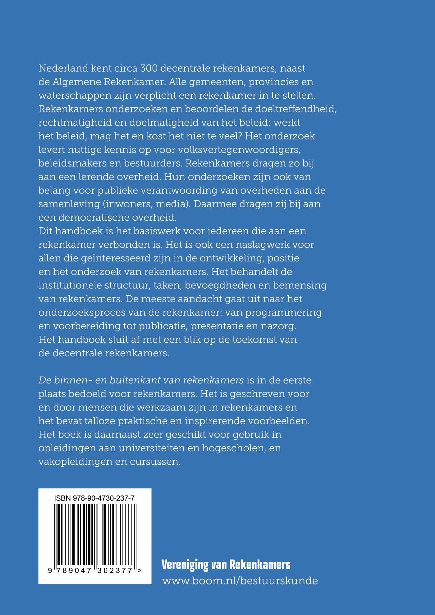Dit handboek is het basiswerk voor iedereen die aan een rekenkamer verbonden is. Het is ook een naslagwerk voor allen die geïnteresseerd zijn in de ontwikkeling, positie en het onderzoek van rekenkamers. Het behandelt de institutionele structuur, taken, bevoegdheden en bemensing van rekenkamers. De meeste aandacht gaat uit naar het onderzoeksproces van de rekenkamer: van programmering en voorbereiding tot publicatie, presentatie en nazorg. Het handboek sluit af met een blik op de toekomst van de decentrale rekenkamers.