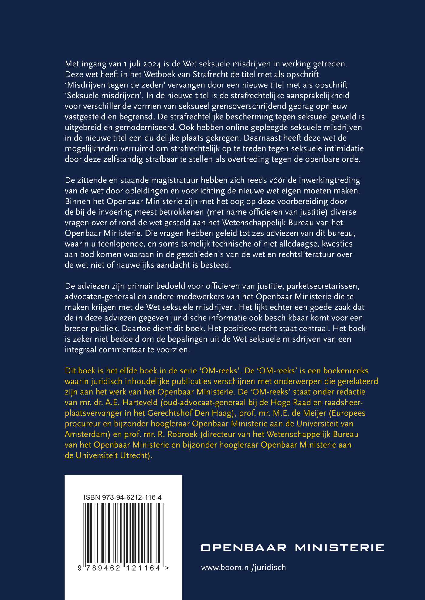 De adviezen zijn primair bedoeld voor officieren van justitie, parketsecretarissen, advocaten-generaal en andere medewerkers van het Openbaar Ministerie die te maken krijgen met de Wet seksuele misdrijven. Het lijkt echter een goede zaak dat de in deze adviezen gegeven juridische informatie ook beschikbaar komt voor een breder publiek. Daartoe dient dit boek. Het positieve recht staat centraal. Het boek is zeker niet bedoeld om de bepalingen uit de Wet seksuele misdrijven van een integraal commentaar te voorzien.