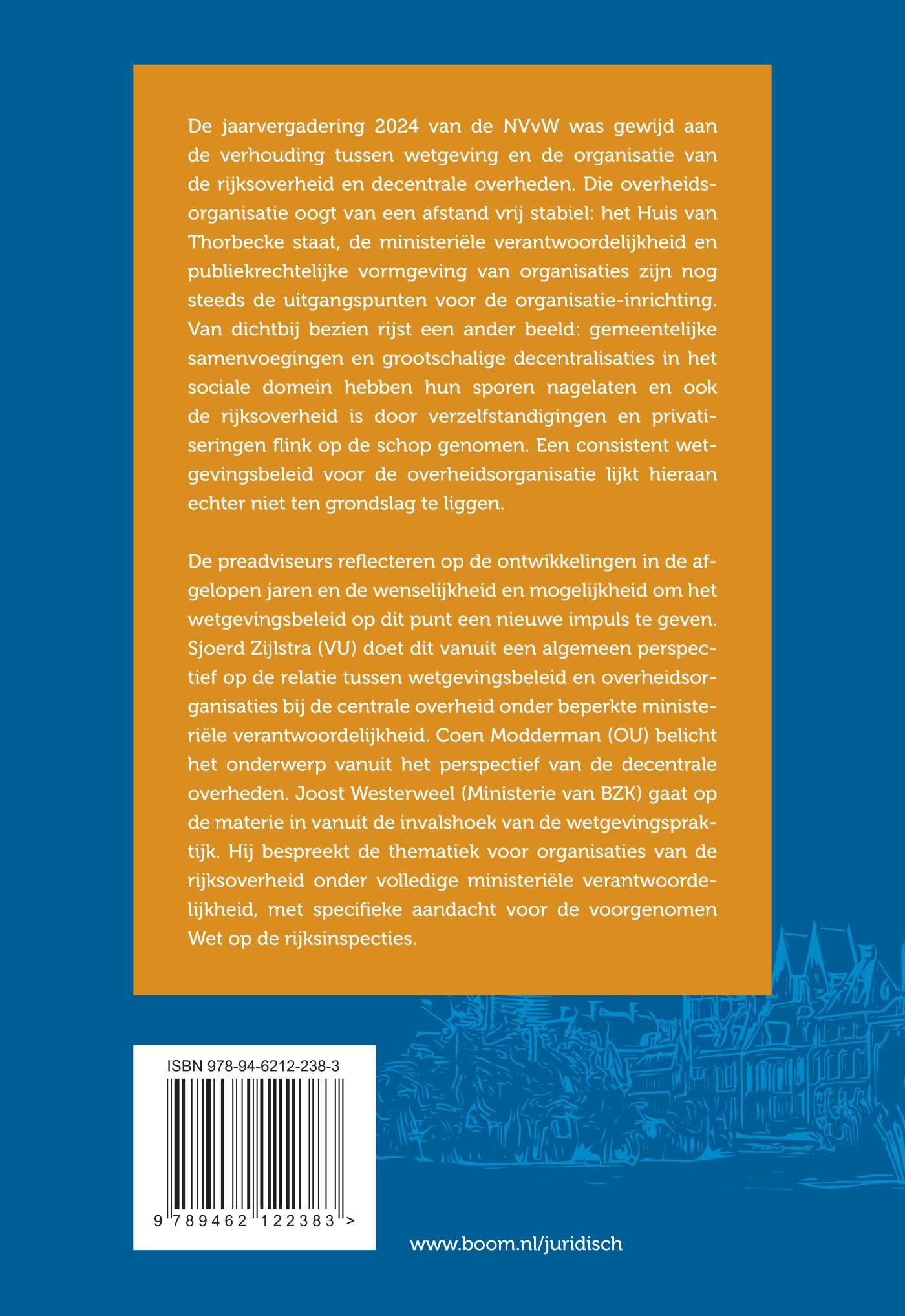 De preadviseurs reflecteren op de ontwikkelingen in de afgelopen jaren en de wenselijkheid en mogelijkheid om het wetgevingsbeleid op dit punt een nieuwe impuls te geven. Sjoerd Zijlstra (VU) doet dit vanuit een algemeen perspectief op de relatie tussen wetgevingsbeleid en overheidsorganisaties bij de centrale overheid onder beperkte ministeriële verantwoordelijkheid. Coen Modderman (OU) belicht het onderwerp vanuit het perspectief van de decentrale overheden. Joost Westerweel (Ministerie van BZK) gaat op de materie in vanuit de invalshoek van de wetgevingspraktijk. Hij bespreekt de thematiek voor organisaties van de rijksoverheid onder volledige ministeriële verantwoordelijkheid, met specifieke aandacht voor de voorgenomen Wet op de rijksinspecties.