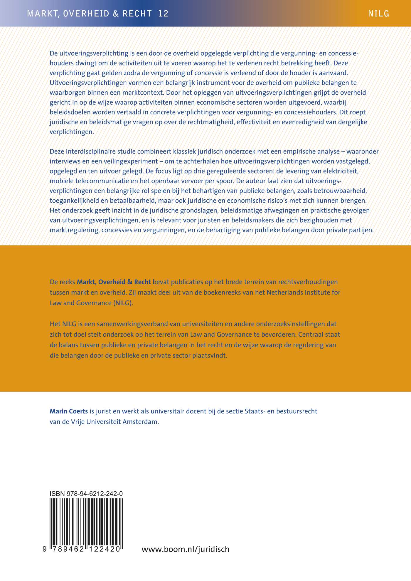 Deze interdisciplinaire studie combineert klassiek juridisch onderzoek met een empirische analyse – waaronder interviews en een veilingexperiment – om te achterhalen hoe uitvoeringsverplichtingen worden vastgelegd, opgelegd en ten uitvoer gelegd. De focus ligt op drie gereguleerde sectoren: de levering van elektriciteit, mobiele telecommunicatie en het openbaar vervoer per spoor. De auteur laat zien dat uitvoeringsverplichtingen een belangrijke rol spelen bij het behartigen van publieke belangen, zoals betrouwbaar heid, toegankelijkheid en betaalbaarheid, maar ook juridische en economische risico’s met zich kunnen brengen. Het onderzoek geeft inzicht in de juridische grondslagen, beleidsmatige afwegingen en praktische gevolgen van uitvoeringsverplichtingen, en is relevant voor juristen en beleidsmakers die zich bezighouden met marktregulering, concessies en vergunningen, en de behartiging van publieke belangen door private partijen.