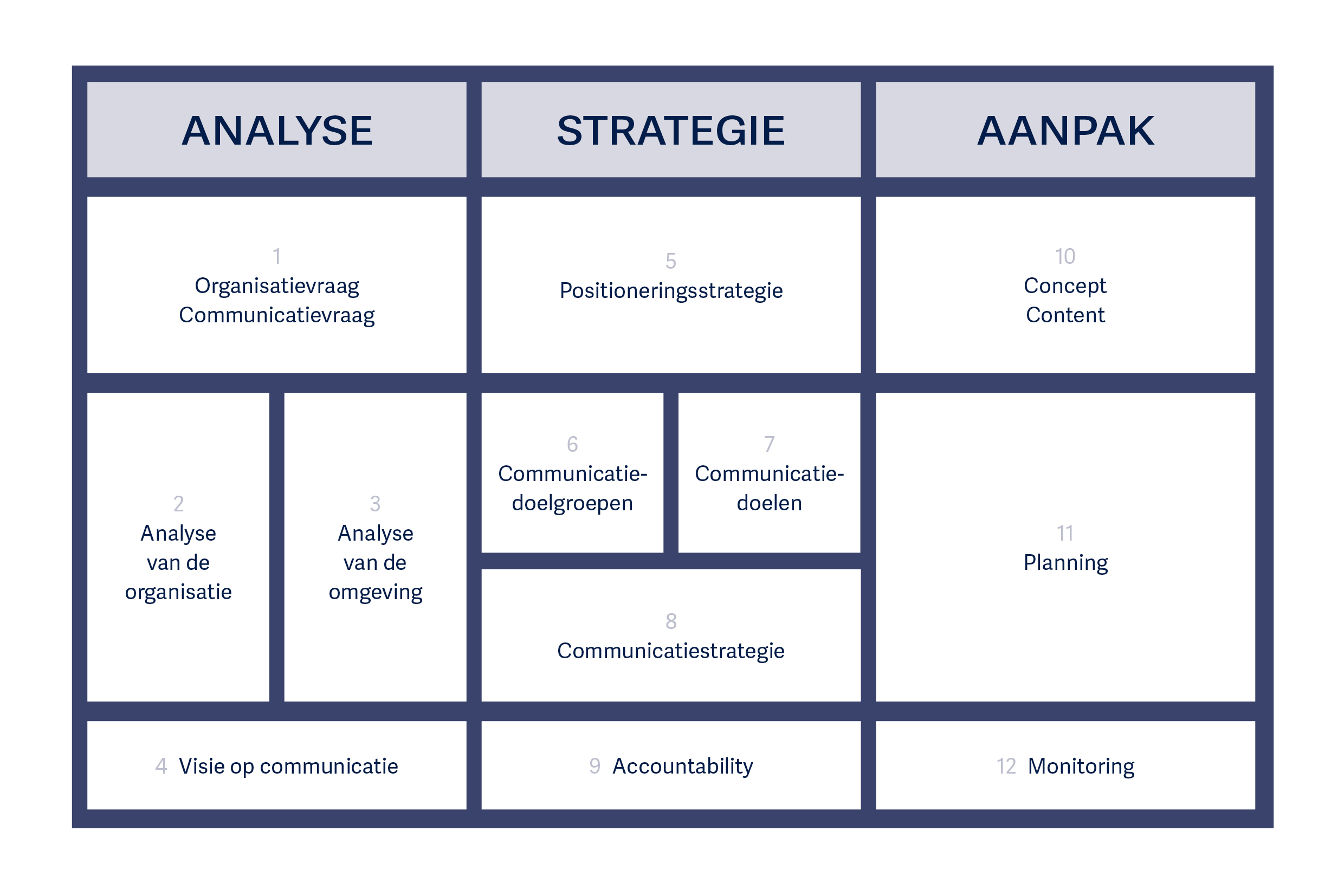 Het Communicatie Model bestaat uit drie blokken: Analyse, Strategie en Aanpak die als fundering dienen voor 12 bouwstenen. Als je deze 12 bouwstenen uitwerkt, creëer je een zeer solide basis en een scherpe focus waarmee je direct aan de slag kan. Zo is voor iedereen duidelijk waar communicatie voor staat en gaat.