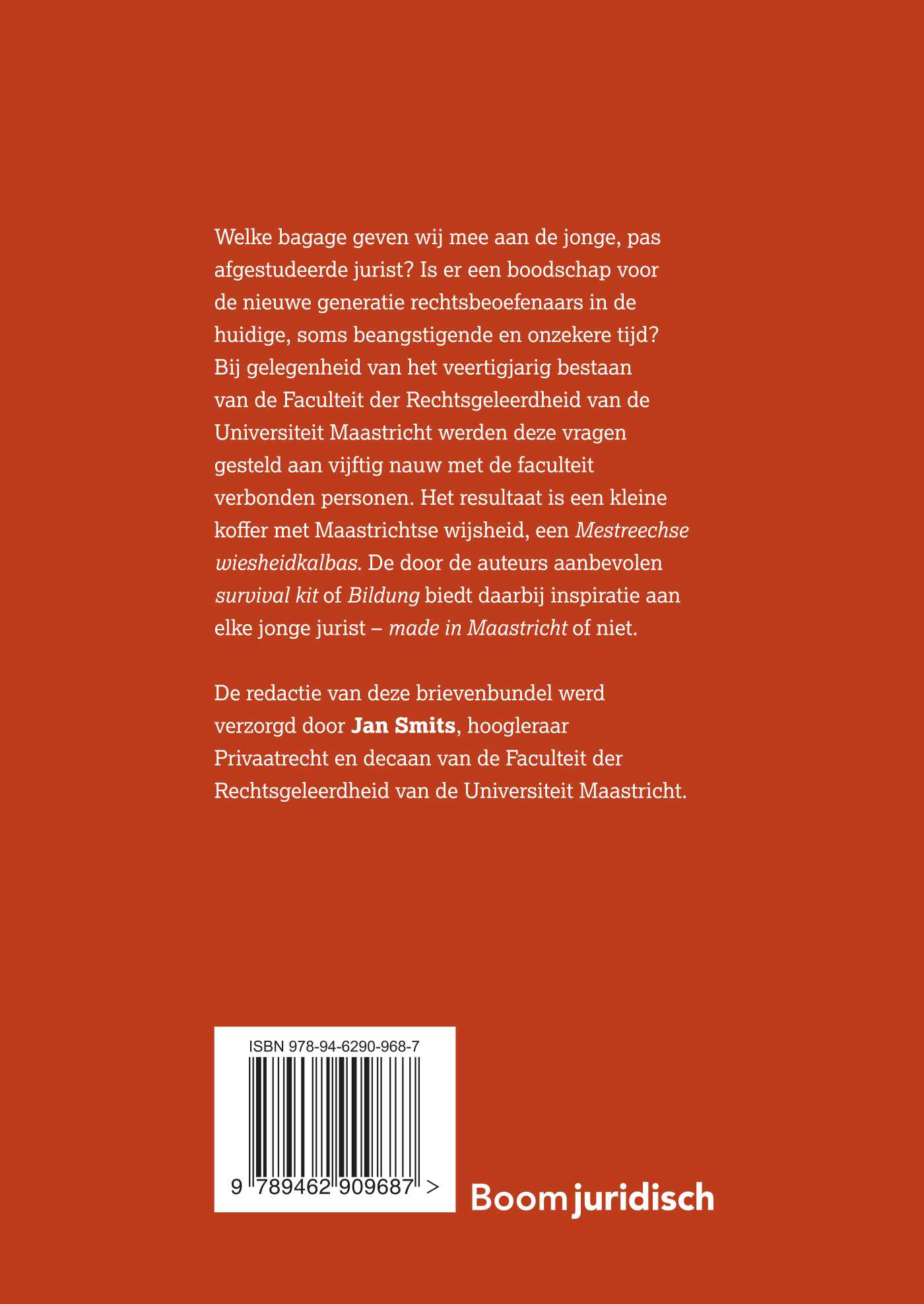 Welke bagage geven wij mee aan de jonge, pas afgestudeerde jurist? Is er een boodschap voor de nieuwe generatie rechtsbeoefenaars in de huidige, soms beangstigende en onzekere tijd? Bij gelegenheid van het veertigjarig bestaan van de Faculteit der Rechtsgeleerdheid van de Universiteit Maastricht werden deze vragen gesteld aan vijftig nauw met de faculteit verbonden personen. Het resultaat is een kleine koffer met Maastrichtse wijsheid, een Mestreechse wiesheidkalbas. De door de auteurs aanbevolen survival kit of Bildung biedt daarbij inspiratie aan elke jonge jurist – made in Maastricht of niet.
