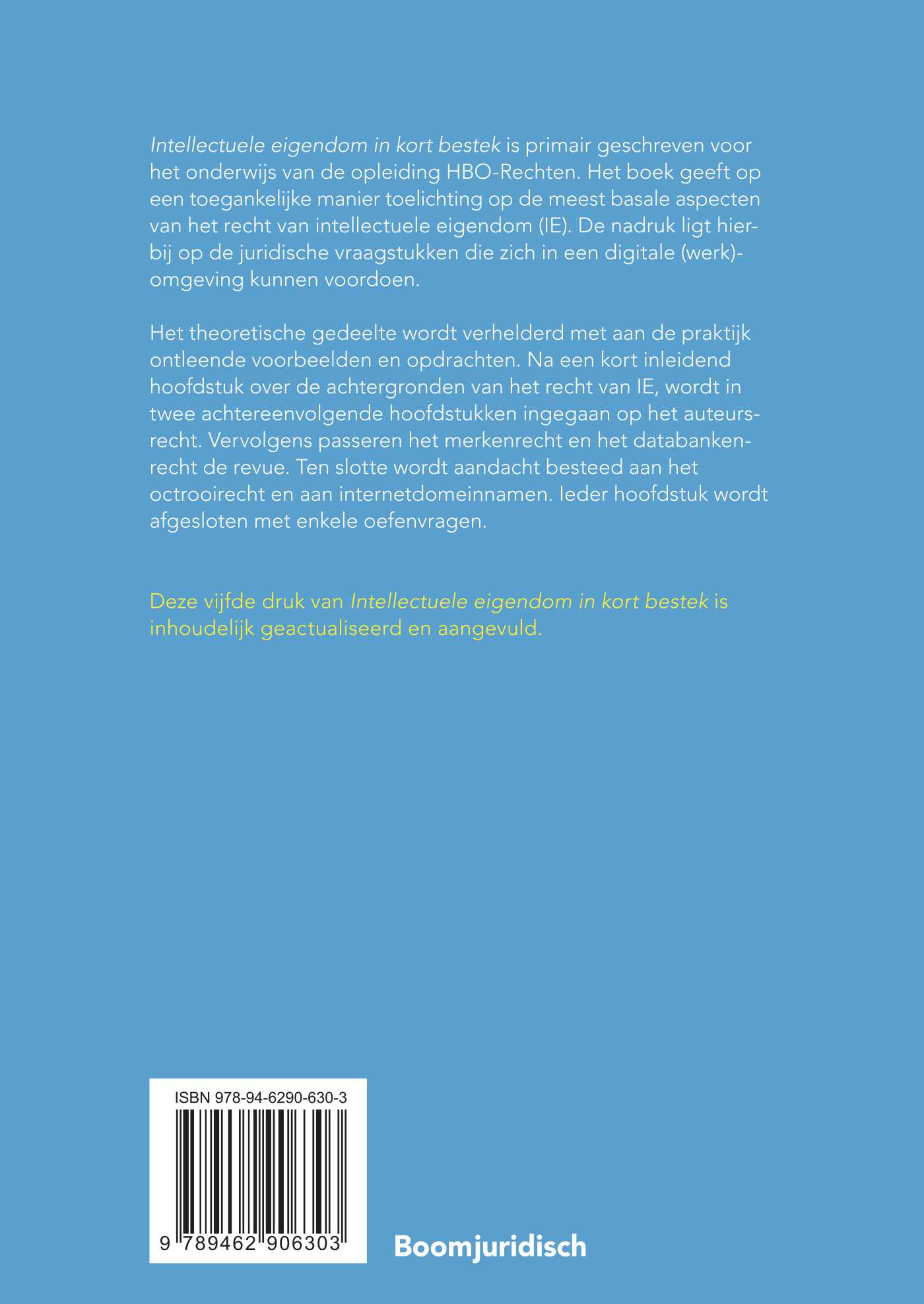 Intellectuele eigendom in kort bestek is primair geschreven voor het onderwijs van de opleiding hbo-rechten. Het boek geeft op een toegankelijke manier toelichting op de meest basale aspecten van het recht van intellectuele eigendom (IE). De nadruk ligt hierbij op de juridische vraagstukken die zich in een digitale (werk)omgeving kunnen voordoen.