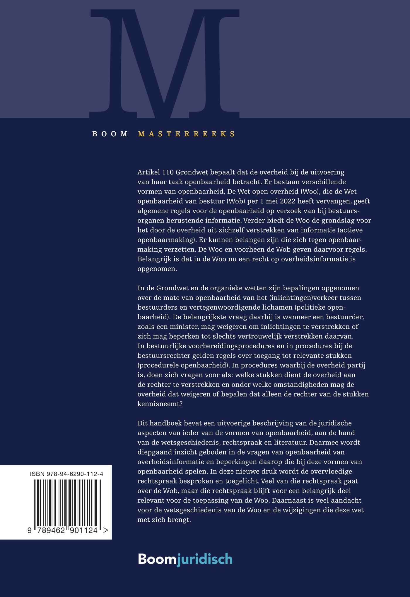 Dit handboek bevat een uitvoerige beschrijving van de juridische aspecten van ieder van de vormen van openbaarheid, aan de hand van de wetsgeschiedenis, rechtspraak en literatuur. Daarmee wordt diepgaand inzicht geboden in de vragen van openbaarheid van overheidsinformatie en beperkingen daarop die bij deze vormen van openbaarheid spelen. In deze nieuwe druk wordt de overvloedige rechtspraak besproken en toegelicht. Veel van die rechtspraak gaat over de Wob, maar die rechtspraak blijft voor een belangrijk deel relevant voor de toepassing van de Woo. Daarnaast is veel aandacht voor de wetsgeschiedenis van de Woo en de wijzigingen die deze wet met zich brengt.