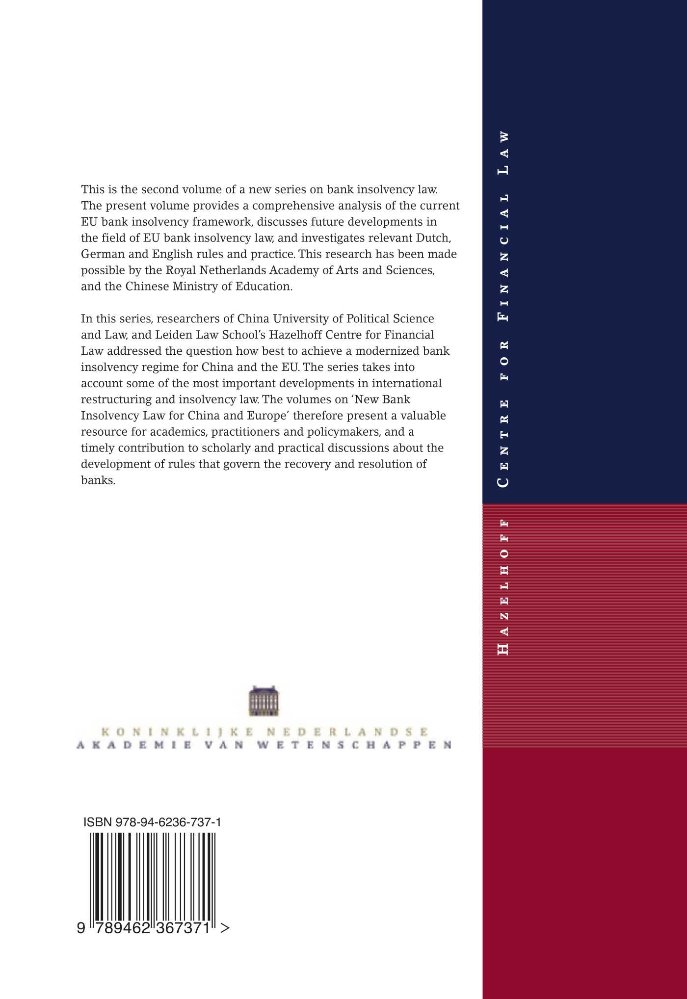 This is the second volume of a new series on ‘New Bank Insolvency Law for China and Europe’. The current volume provides a comprehensive analysis of the current EU bank insolvency framework, discusses future developments in the field of EU bank insolvency law, and investigates relevant Dutch, German and English rules and practice. This research has been made possible by the Royal Netherlands Academy of Arts and Sciences, and the Chinese Ministry of Education.