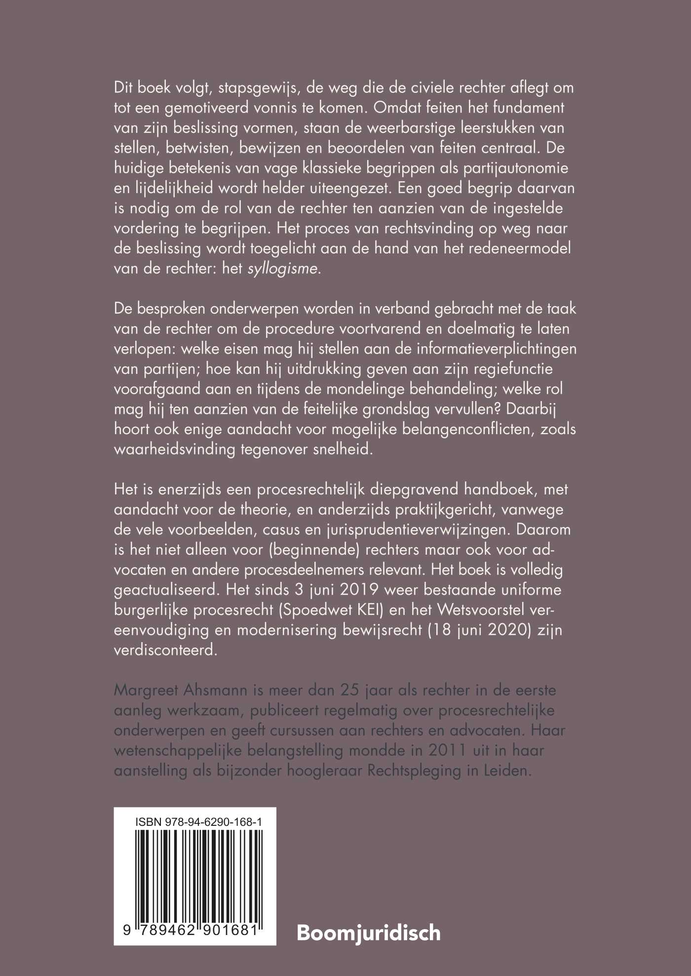 Het is enerzijds een procesrechtelijk diepgravend handboek, met aandacht voor de theorie, en anderzijds praktijkgericht, vanwege de vele voorbeelden, casus en jurisprudentieverwijzingen. Daarom is het niet alleen voor (beginnende) rechters maar ook voor advocaten en andere procesdeelnemers relevant. Het boek is volledig geactualiseerd. Het sinds 3 juni 2019 weer bestaande uniforme burgerlijke procesrecht (Spoedwet KEI) en het Wetsvoorstel vereenvoudiging en modernisering bewijsrecht (18 juni 2020) zijn verdisconteerd.