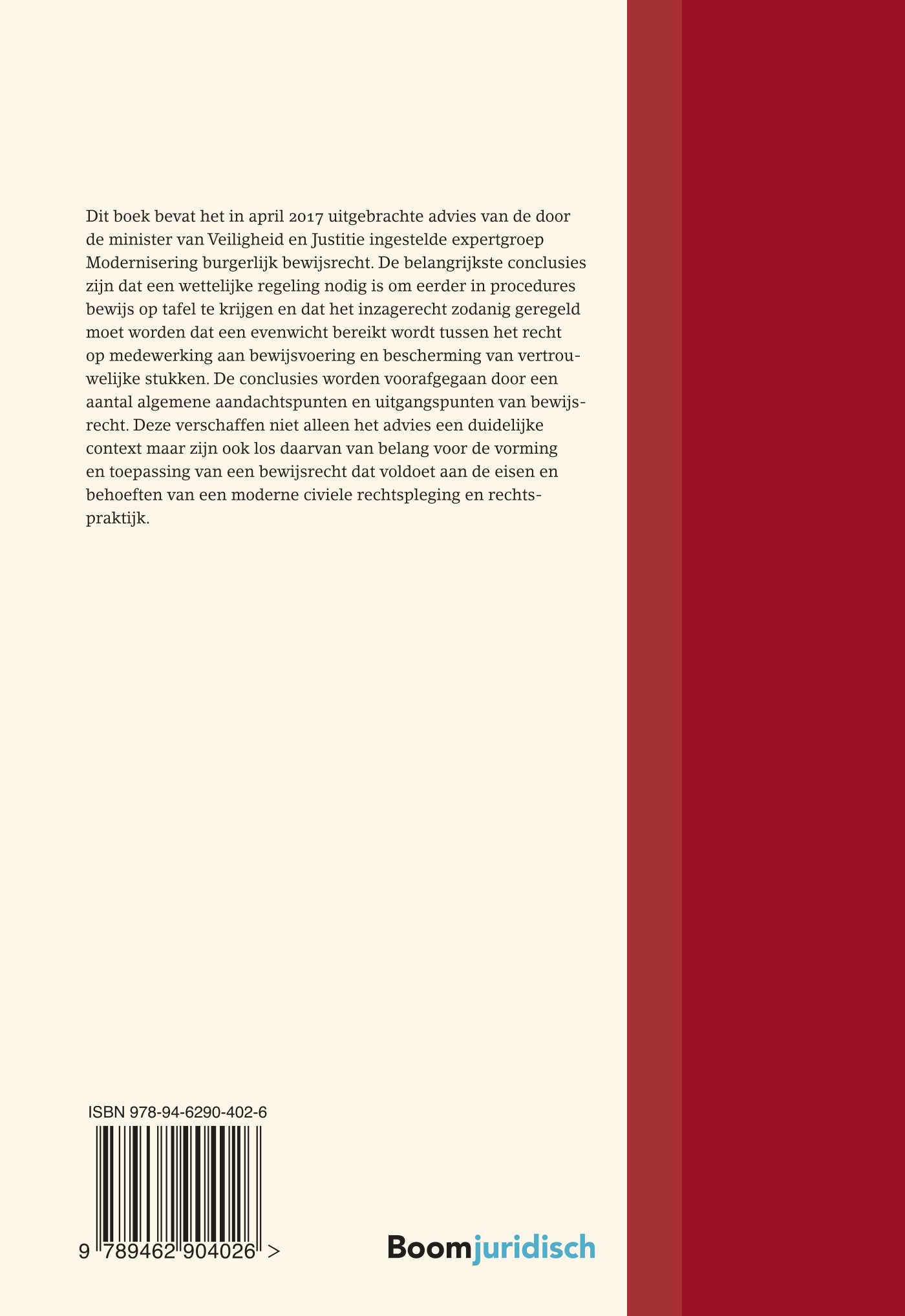 Dit boek bevat het in april 2017 uitgebrachte advies van de door de minister van Veiligheid en Justitie ingestelde expertgroep Modernisering burgerlijk bewijsrecht. De belangrijkste conclusies zijn dat een wettelijke regeling nodig is om eerder in procedures bewijs op tafel te krijgen en dat het inzagerecht zodanig geregeld moet worden dat een evenwicht bereikt wordt tussen het recht op medewerking aan bewijsvoering en bescherming van vertrouwelijke stukken. De conclusies worden voorafgegaan door een aantal algemene aandachtspunten en uitgangspunten van bewijsrecht. Deze verschaffen niet alleen het advies een duidelijke context maar zijn ook los daarvan van belang voor de vorming en toepassing van een bewijsrecht dat voldoet aan de eisen en behoeften van een moderne civiele rechtspleging en rechtspraktijk.
