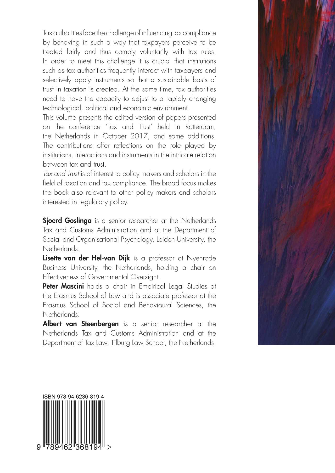This volume presents the edited version of papers presented on the conference ‘Tax and Trust’ held in Rotterdam, the Netherlands in October 2017, and some additions. The contributions offer reflections on the role played by institutions, interactions and instruments in the intricate relation between tax and trust.