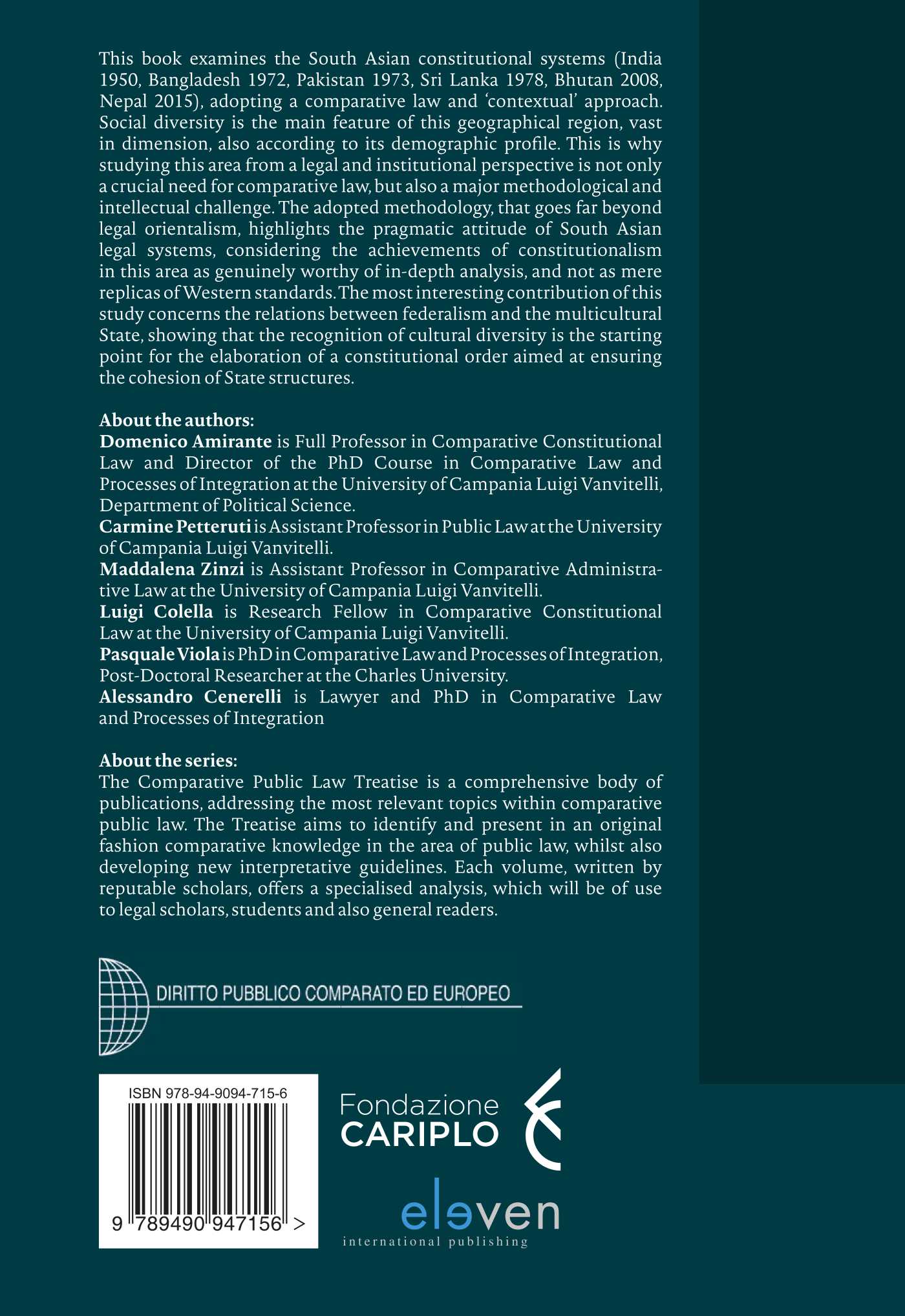 This book examines the South Asian constitutional systems (India 1950, Bangladesh 1972, Pakistan 1973, Sri Lanka 1978, Bhutan 2008, Nepal 2015), adopting a comparative law and ‘contextual’ approach. Social diversity is the main feature of this geographical region, vast in dimension, also according to its demographic profile. This is why studying this area from a legal and institutional perspective is not only a crucial need for comparative law, but also a major methodological and intellectual challenge. The adopted methodology, that goes far beyond legal orientalism, highlights the pragmatic attitude of South Asian legal systems, considering the achievements of constitutionalism in this area as genuinely worthy of in-depth analysis, and not as mere replicas of Western standards. The most interesting contribution of this study concerns the relations between federalism and the multicultural State, showing that the recognition of cultural diversity is the starting point for the elaboration of a constitutional order aimed at ensuring the cohesion of State structures.