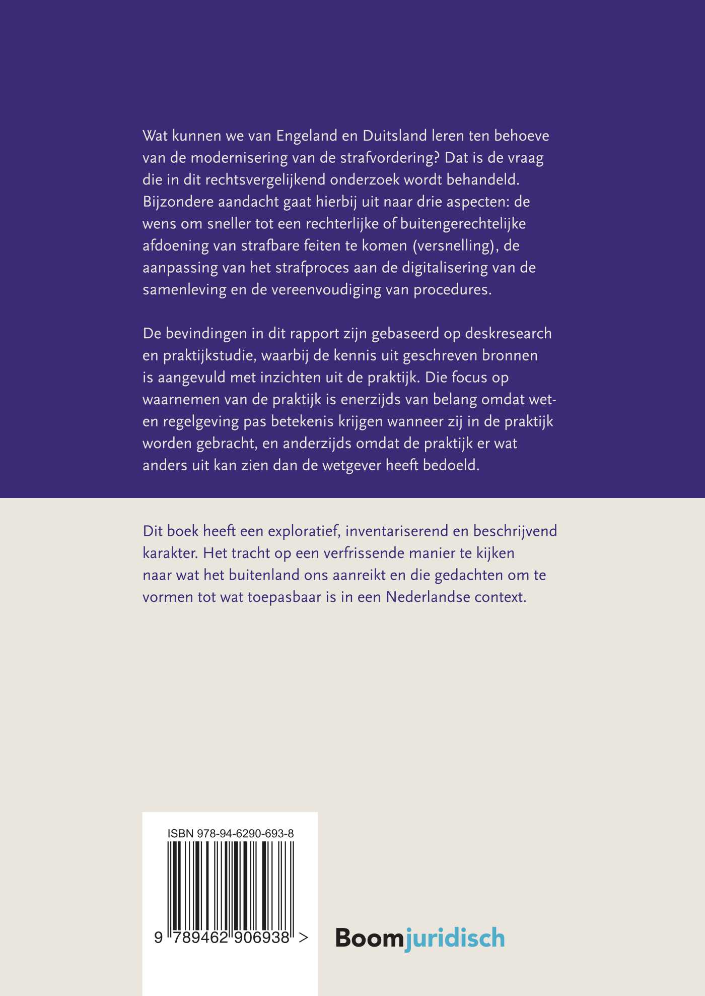 Wat kunnen we van Engeland en Duitsland leren ten behoeve van de modernisering van de strafvordering? Dat is de vraag die in dit rechtsvergelijkend onderzoek wordt behandeld. Bijzondere aandacht gaat hierbij uit naar drie aspecten: de wens om sneller tot een rechterlijke of buitengerechtelijke afdoening van strafbare feiten te komen (versnelling), de aanpassing van het strafproces aan de digitalisering van de samenleving en de vereenvoudiging van procedures.