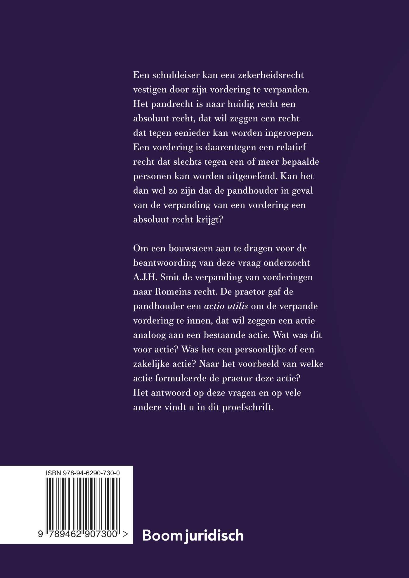 Om een bouwsteen aan te dragen voor de beantwoording van deze vraag onderzocht A.J.H. Smit de verpanding van vorderingen naar Romeins recht. De praetor gaf de pandhouder een actio utilis om de verpande vordering te innen, dat wil zeggen een actie analoog aan een bestaande actie. Wat was dit voor actie? Was het een persoonlijke of een zakelijke actie? Naar het voorbeeld van welke actie formuleerde de praetor deze actie? Het antwoord op deze vragen en op vele andere vindt u in dit proefschrift.