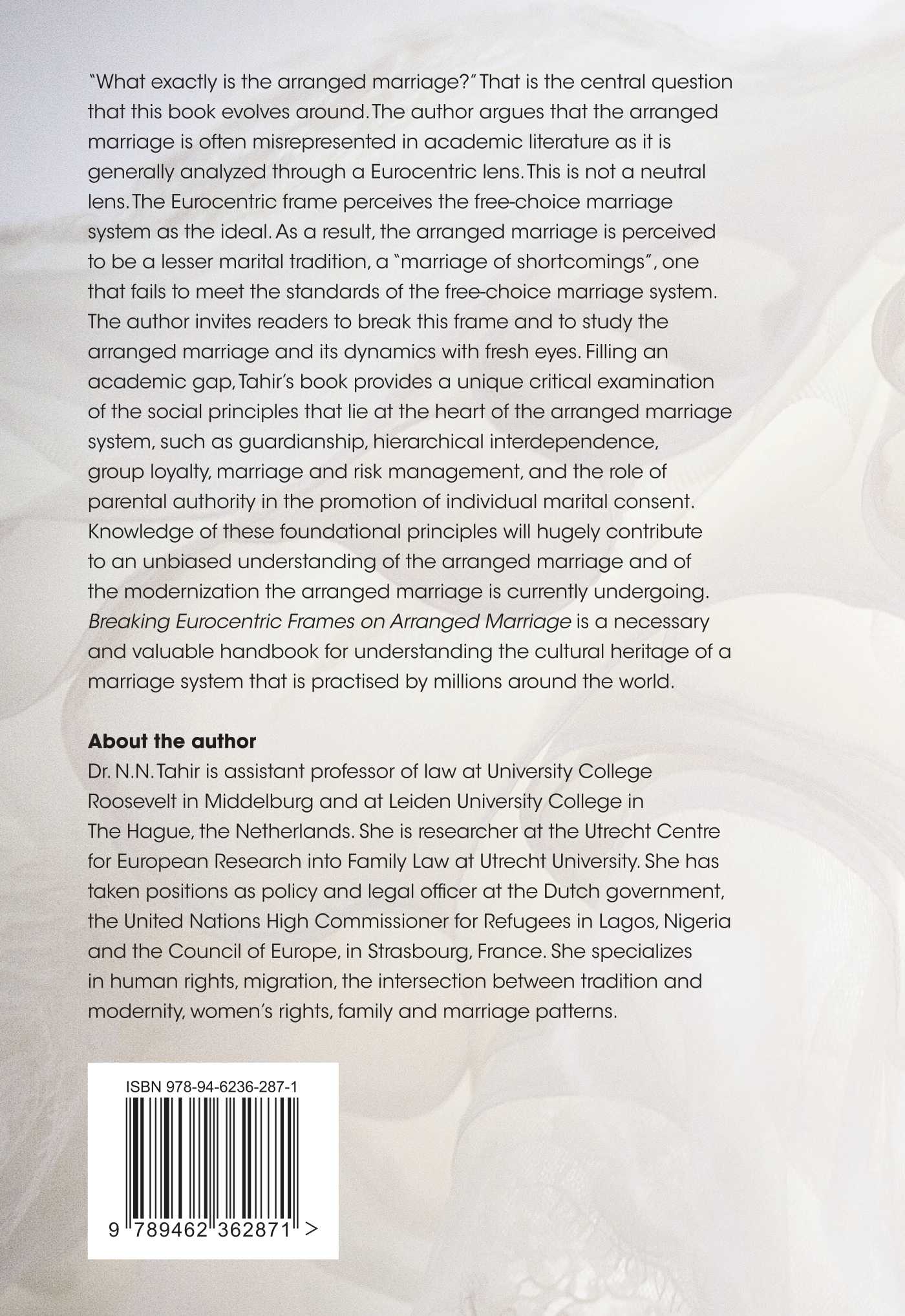 “What exactly is the arranged marriage?” That is the central question that this book evolves around. The author argues that the arranged marriage is often misrepresented in academic literature as it is generally analyzed through a Eurocentric lens. This is not a neutral lens. The Eurocentric frame perceives the free-choice marriage system as the ideal. As a result, the arranged marriage is perceived to be a lesser marital tradition, a “marriage of shortcomings”, one that fails to meet the standards of the free-choice marriage system. The author invites readers to break this frame and to study the arranged marriage and its dynamics with fresh eyes. Filling an academic gap, Tahir’s book provides a unique critical examination of the social principles that lie at the heart of the arranged marriage system, such as guardianship, hierarchical interdependence, group loyalty, marriage and risk management, and the role of parental authority in the promotion of individual marital consent. Knowledge of these foundational principles will hugely contribute to an unbiased understanding of the arranged marriage and of the modernization the arranged marriage is currently undergoing. Breaking Eurocentric Frames on Arranged Marriage is a necessary and valuable handbook for understanding the cultural heritage of a marriage system that is practised by millions around the world.