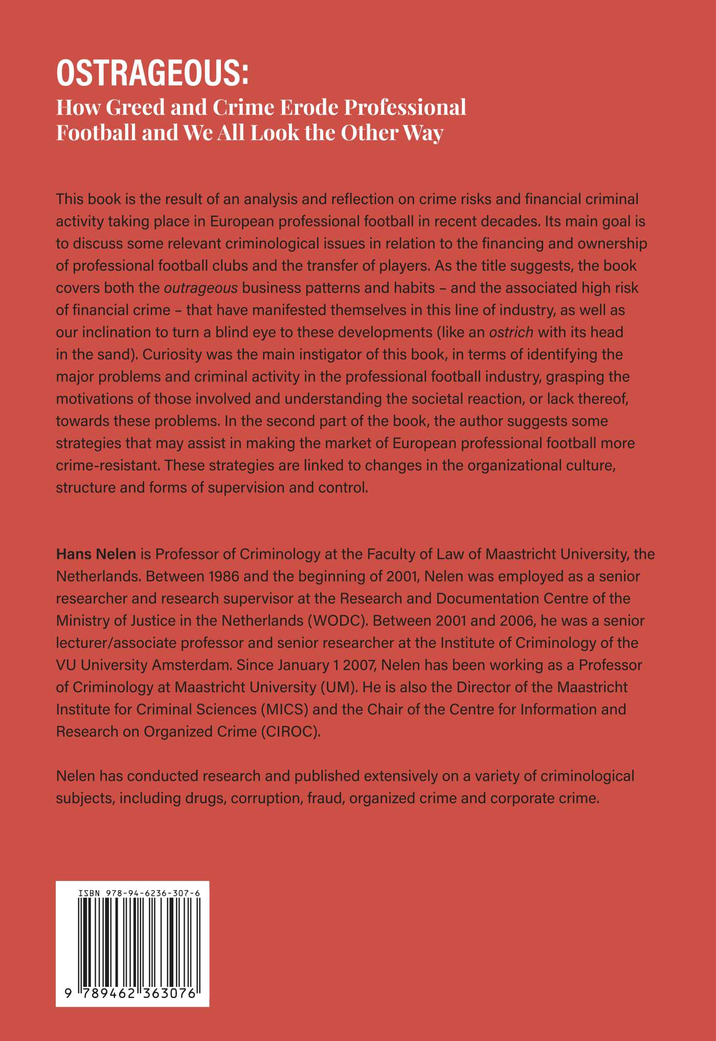 This book is the result of an analysis and reflection on crime risks and financial criminal activity taking place in European professional football in recent decades. Its main goal is to discuss some relevant criminological issues in relation to the financing and ownership of professional football clubs and the transfer of players. As the title suggests, the book covers both the outrageous business patterns and habits – and the associated high risk of financial crime – that have manifested themselves in this line of industry, as well as our inclination to turn a blind eye to these developments (like an ostrich with its head in the sand). Curiosity was the main instigator of this book, in terms of identifying the major problems and criminal activity in the professional football industry, grasping the motivations of those involved and understanding the societal reaction, or lack thereof, towards these problems. In the second part of the book, the author suggests some strategies that may assist in making the market of European professional football more crime-resistant. These strategies are linked to changes in the organizational culture, structure and forms of supervision and control.