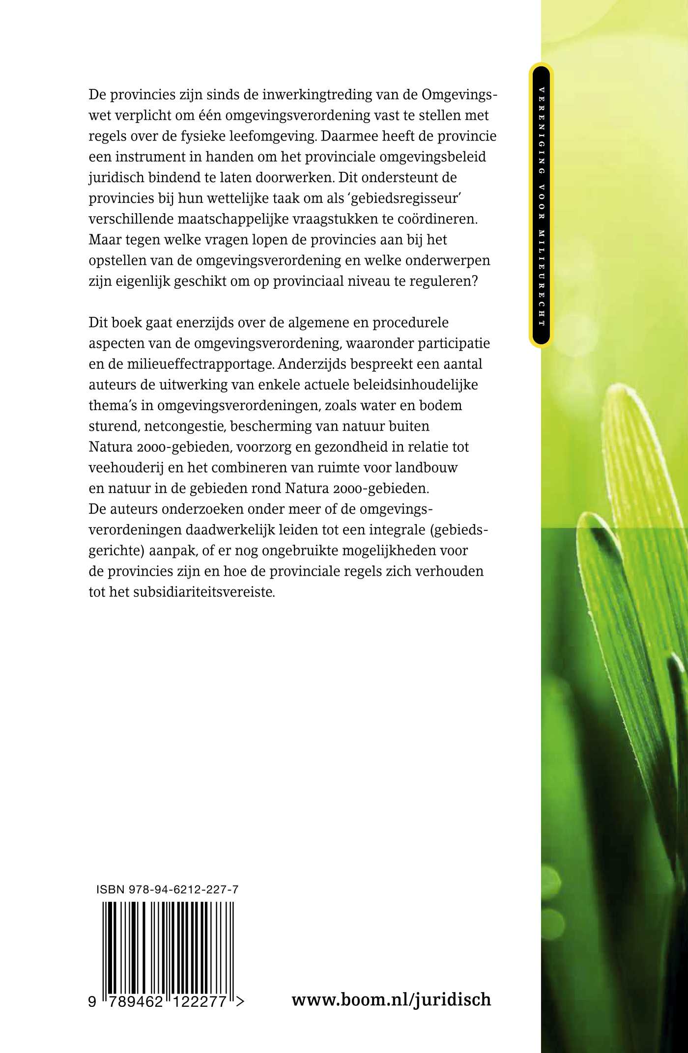 Dit boek gaat enerzijds over de algemene en procedurele aspecten van de omgevingsverordening, waaronder participatie en de milieueffectrapportage. Anderzijds bespreekt een aantal auteurs de uitwerking van enkele actuele beleidsinhoudelijke thema’s in omgevingsverordeningen, zoals water en bodem sturend, netcongestie, bescherming van natuur buiten Natura 2000-gebieden, voorzorg en gezondheid in relatie tot veehouderij en het combineren van ruimte voor landbouw en natuur in de gebieden rond Natura 2000-gebieden. De auteurs onderzoeken onder meer of de omgevingsverordeningen daadwerkelijk leiden tot een integrale (gebiedsgerichte) aanpak, of er nog ongebruikte mogelijkheden voor de provincies zijn en hoe de provinciale regels zich verhouden tot het subsidiariteitsvereiste