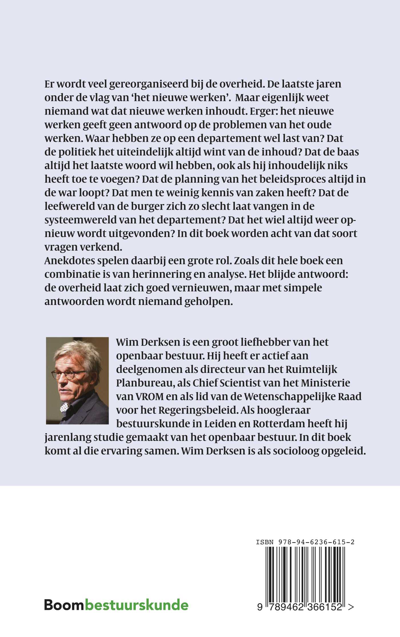 Er wordt veel gereorganiseerd bij de overheid. De laatste jaren onder de vlag van 'het nieuwe werken'. Maar eigenlijk weet niemand wat dat nieuwe werken inhoudt. Erger: het nieuwe werken geeft geen antwoord op de problemen van het oude werken. Waar hebben ze op een departement wel last van? Dat de politiek het uiteindelijk altijd wint van de inhoud? Dat de baas altijd het laatste woord wil hebben, ook als hij inhoudelijk niks heeft toe te voegen? Dat de planning van het beleidsproces altijd in de war loopt? Dat men te weinig kennis van zaken heeft? Dat de leefwereld van de burger zich zo slecht laat vangen in de systeemwereld van het departement? Dat het wiel altijd weer opnieuw wordt uitgevonden? In dit boek worden acht van dat soort vragen verkend. Anekdotes spelen daarbij een grote rol. Zoals dit hele boek een combinatie is van herinnering en analyse. Het blijde antwoord: de overheid laat zich goed vernieuwen, maar met simpele antwoorden wordt niemand geholpen.