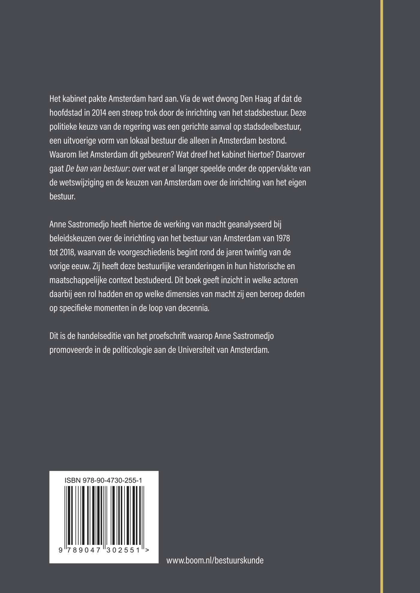 Het kabinet pakte Amsterdam hard aan. Via de wet dwong Den Haag af dat de hoofdstad in 2014 een streep trok door de inrichting van het stadsbestuur. Deze politieke keuze van de regering was een gerichte aanval op stadsdeelbestuur, een uitvoerige vorm van lokaal bestuur die alleen in Amsterdam bestond. Waarom liet Amsterdam dit gebeuren? Wat dreef het kabinet hiertoe? Daarover gaat De ban van bestuur: over wat er al langer speelde onder de oppervlakte van de wetswijziging en de keuzen van Amsterdam over de inrichting van het eigen bestuur.
