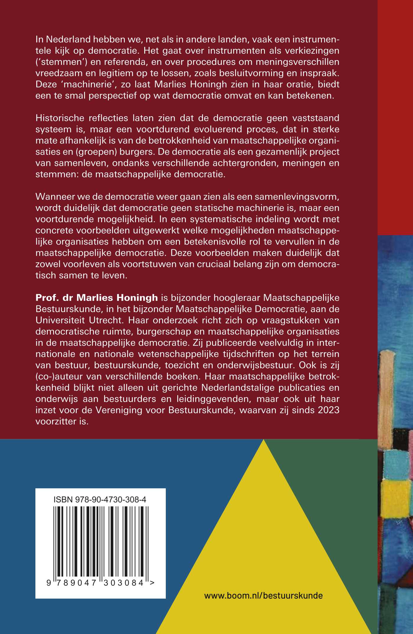 In Nederland hebben we, net als in andere landen, vaak een instrumentele kijk op democratie. Het gaat over instrumenten als verkiezingen (‘stemmen’) en referenda, en over procedures om meningsverschillen vreedzaam en legitiem op te lossen, zoals besluitvorming en inspraak. Deze ‘machinerie’, zo laat Marlies Honingh zien in haar oratie, biedt een te smal perspectief op wat democratie omvat en kan betekenen.